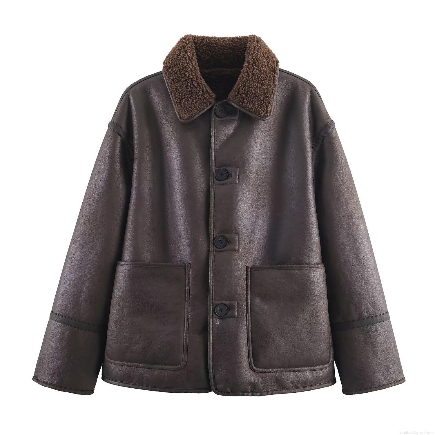 • Women's Reversible Faux Shearling Jacket Double-Sided Faux Leather Winter Outerwear Fashion Casual Warm Jacket With Large Pockets Button-Up Short Coat Coffee