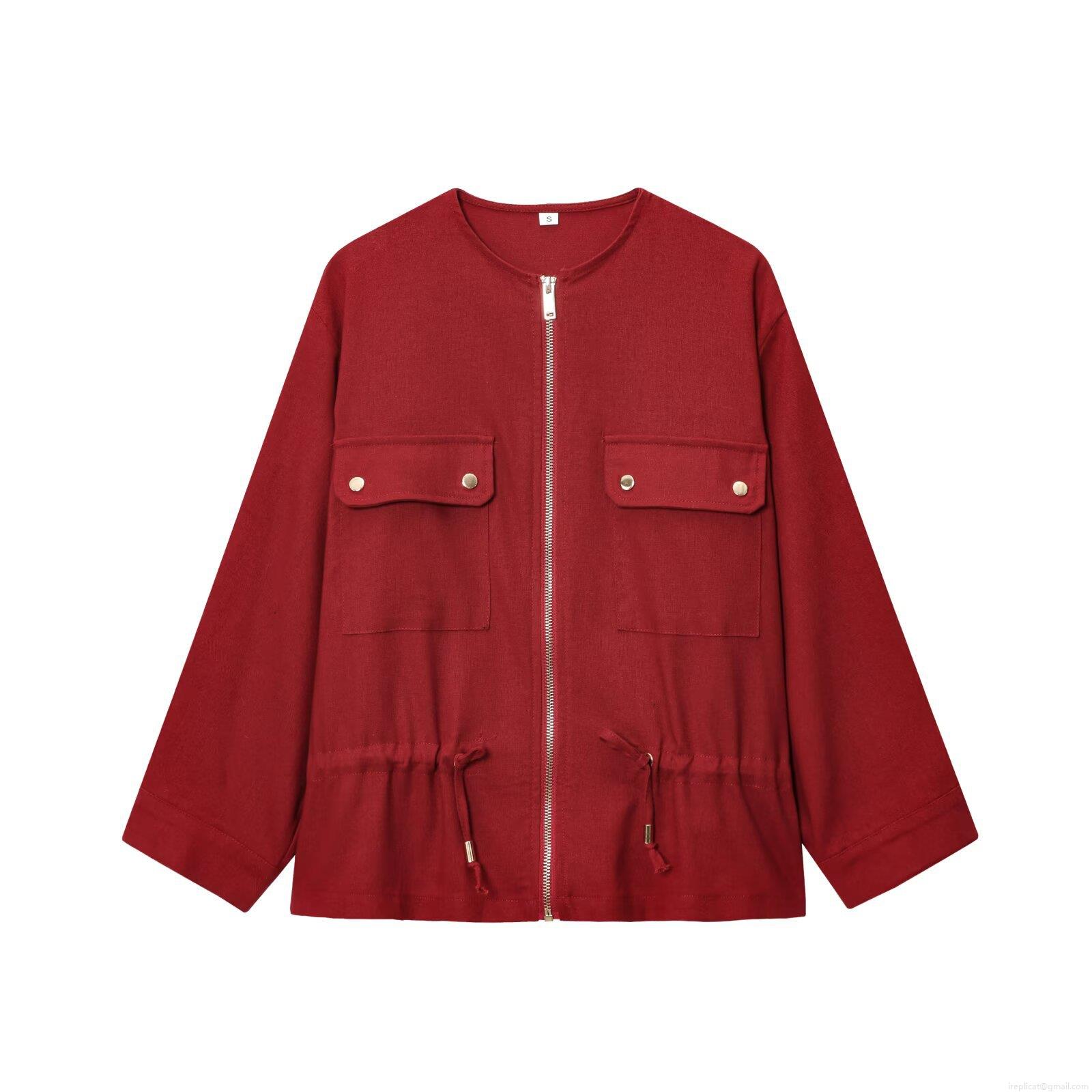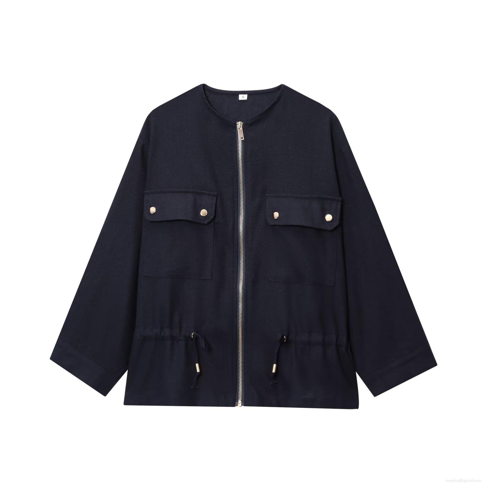 • Women's Round Neck Drawstring Waist Jacket Polyester Blend Solid Color Long Sleeve Zipper Coat Loose Fit Streetwear Outerwear For Autumn