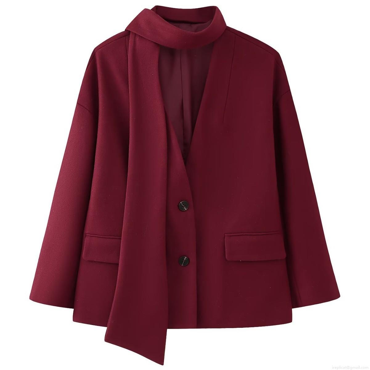 • Women's Scarf Neck Woolen Coat 100% Polyester Warm Long Sleeve Loose Fit Oversized British Style Elegant Burgundy Red Asymmetric Design For Women Lady With Buttons And Side Pockets