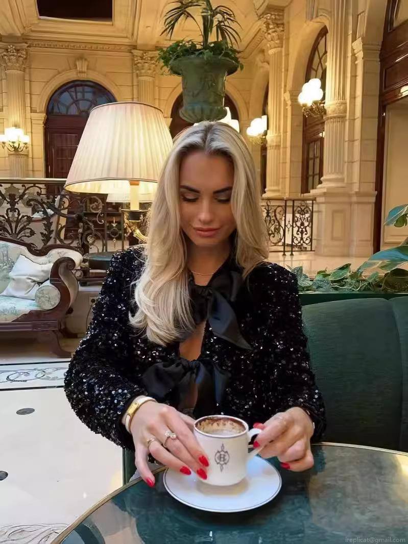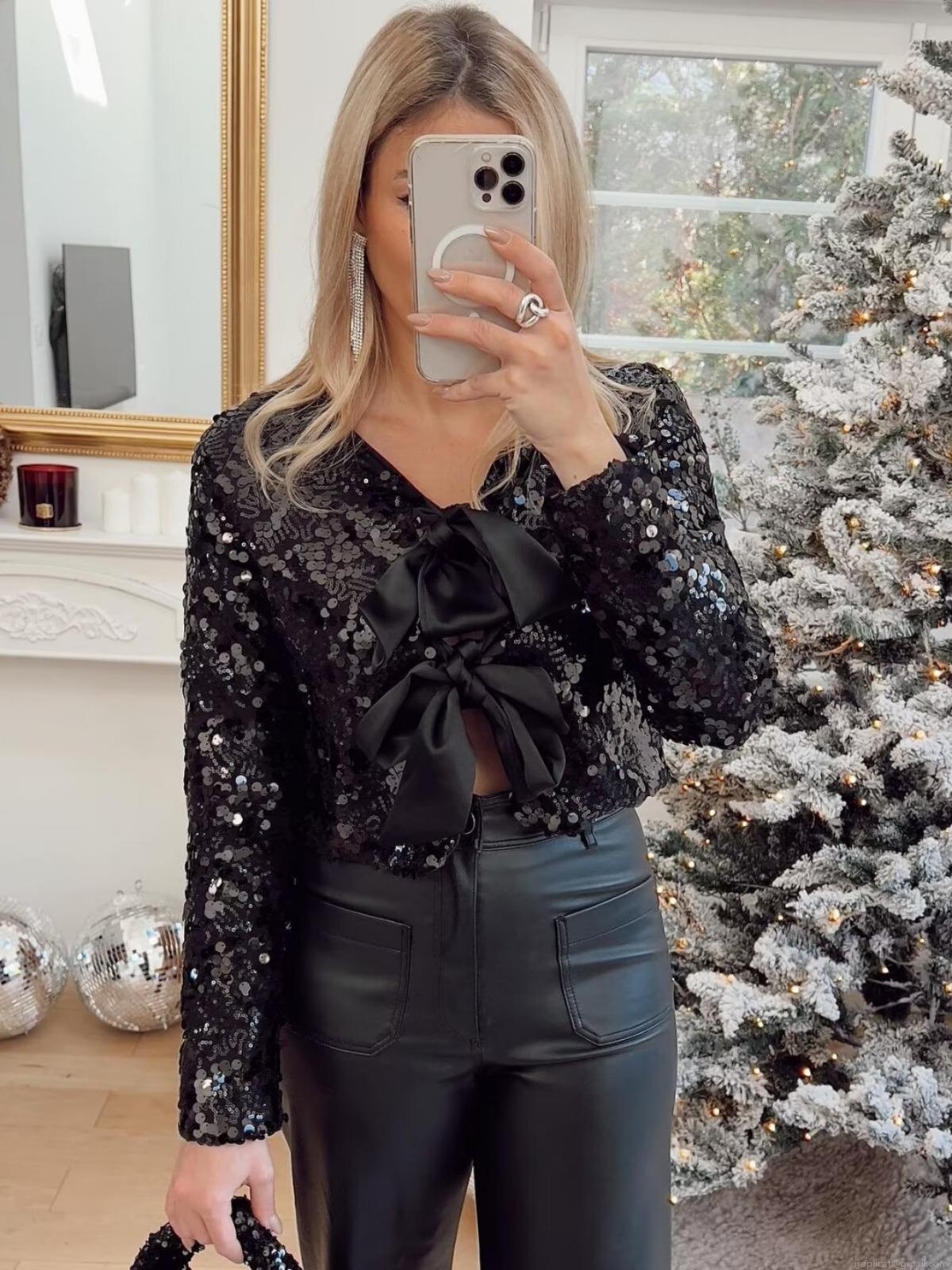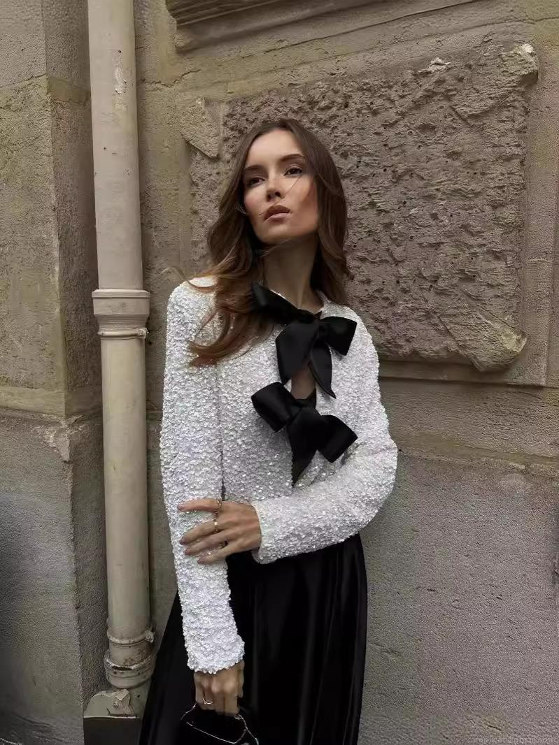 • Women's Sequin Jacket Long Sleeve Elegant Sparkly Outwear with Large Bow Decor Fashion Short Round Neck Jacket for Party Evening Night Club