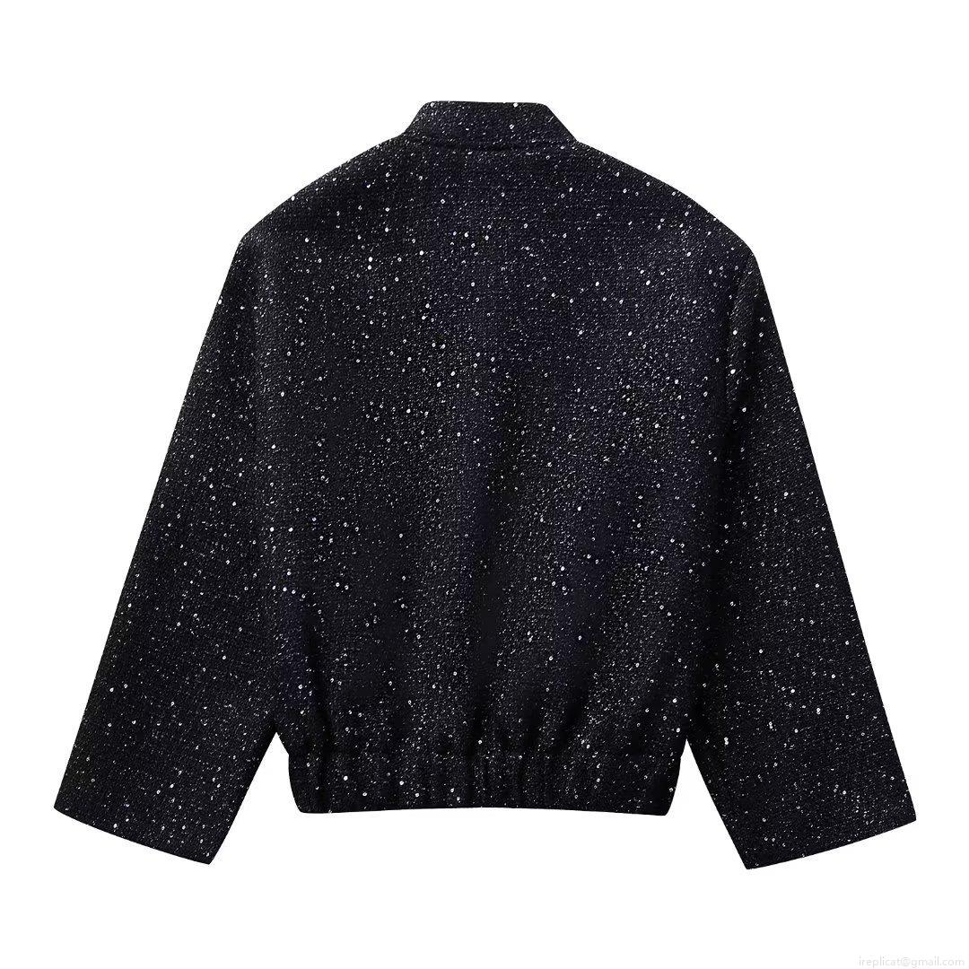 • Women's Sequin Tweed Jacket Casual Zip Up Stand Collar Outerwear Short Coat With Pockets Fashion Streetwear Style Long Sleeve Outerwear For Women