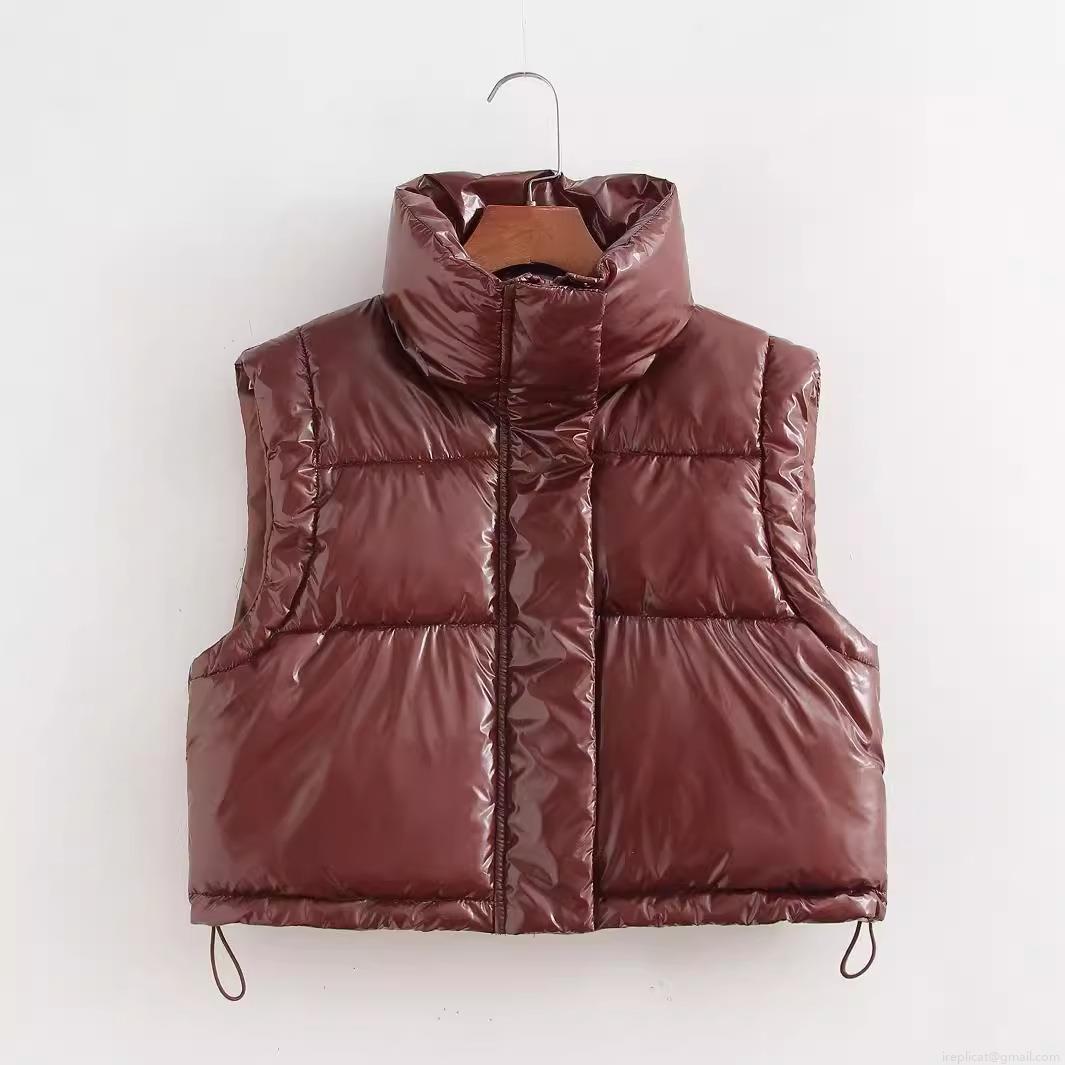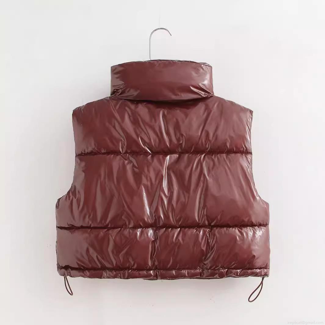 • Women's Shiny Patent Leather Padded Vest Short Motorcycle Style High Collar Sleeveless Puffer Jacket Deep Brown Wine Red Padded Waistcoat for Streetwear Autumn Winter