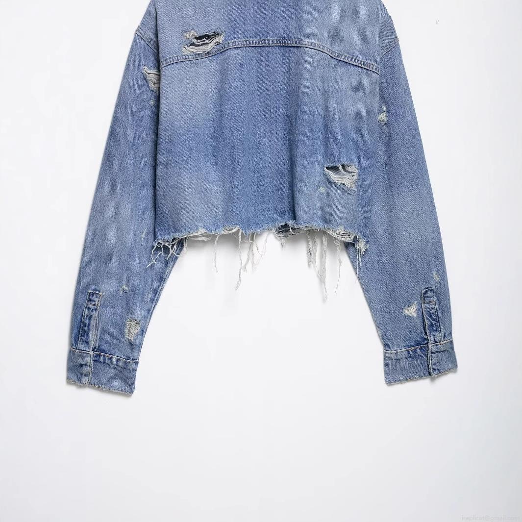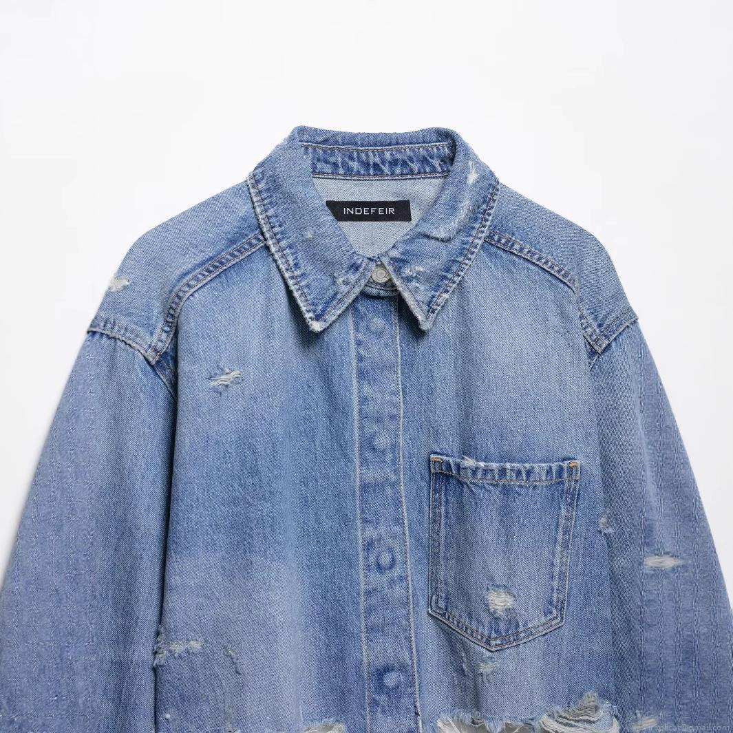 • Women's Short Denim Jacket Distressed Ripped Frayed Hem Long Sleeve Washed Jean Crop Jacket For Women Fashion Casual Streetwear Outerwear