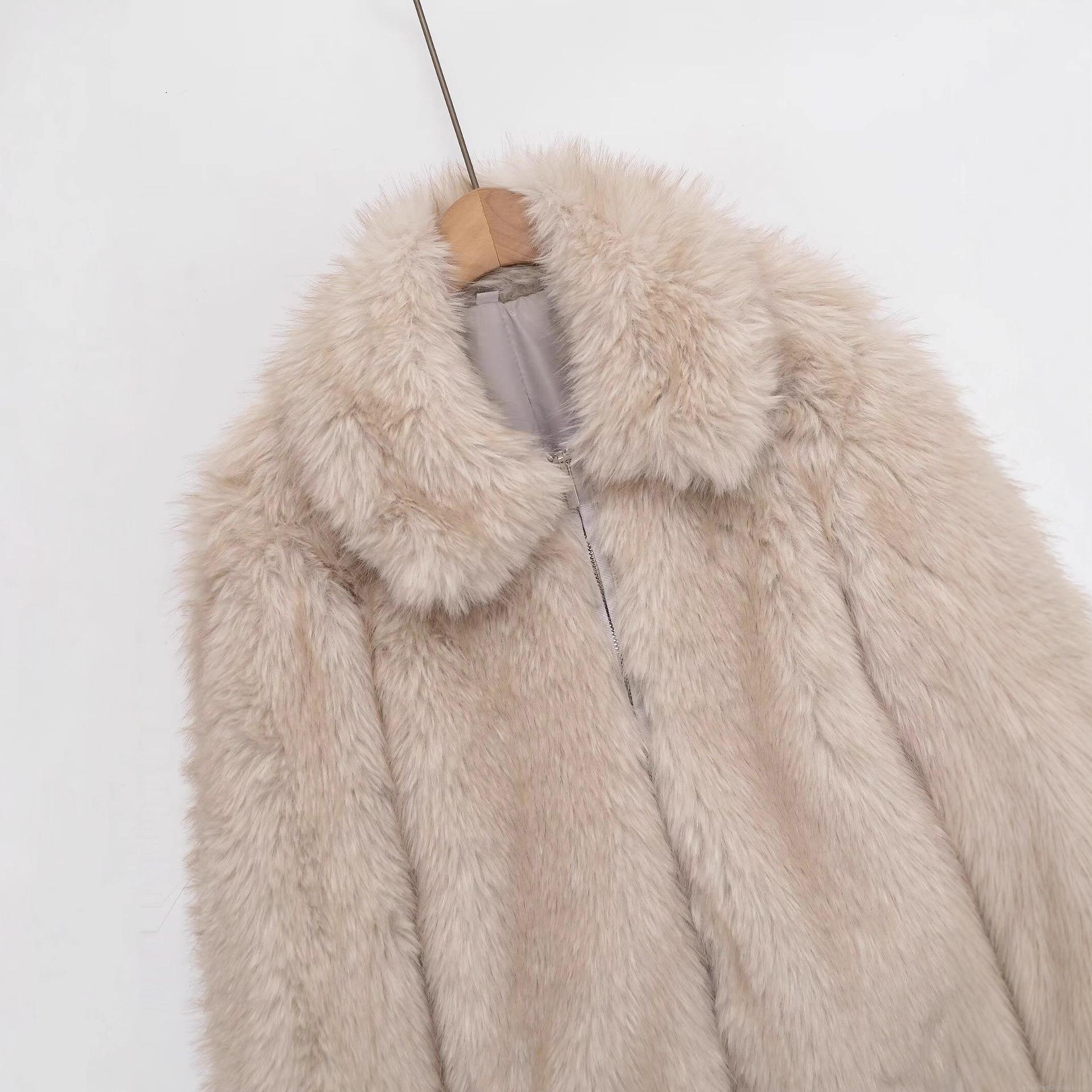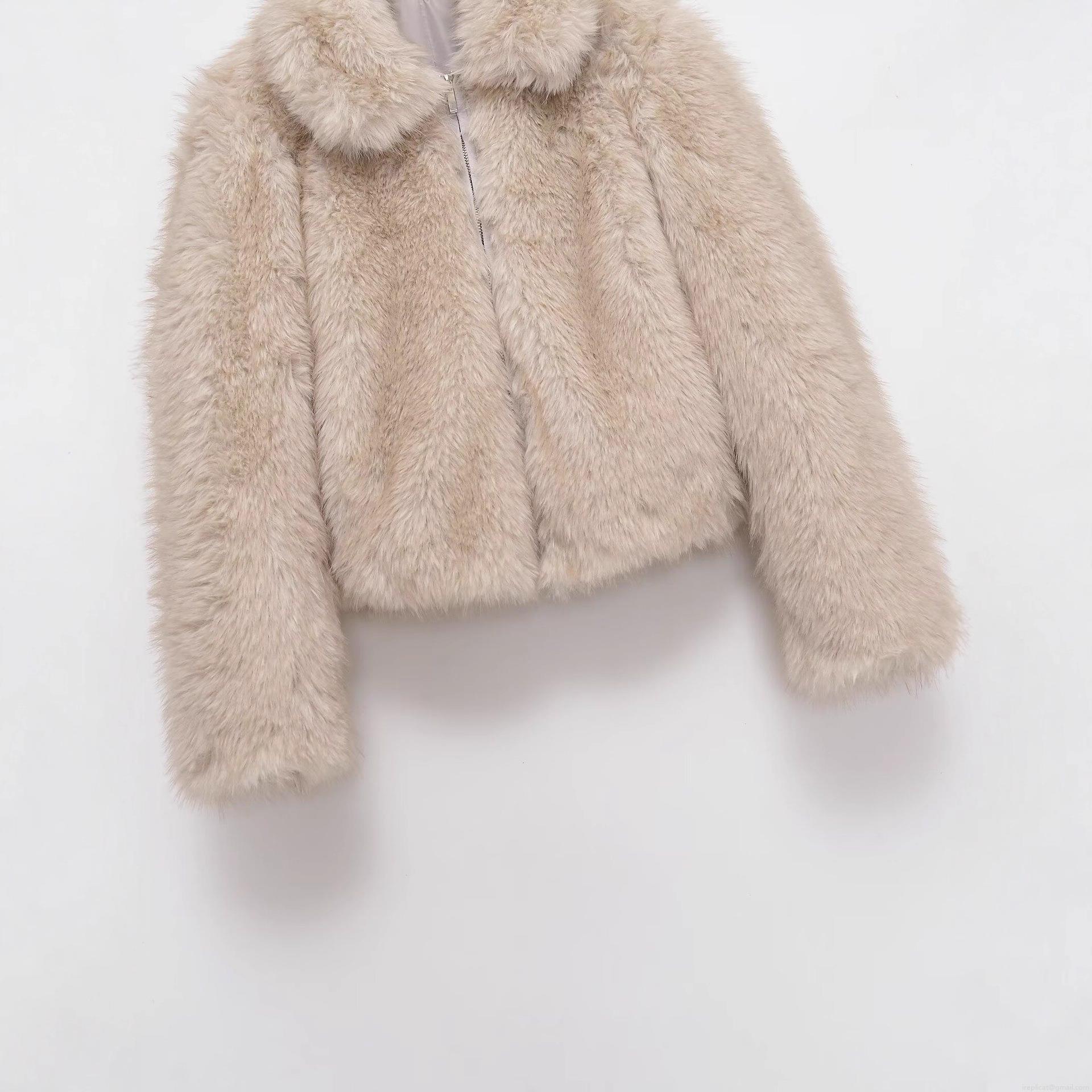 • Women's Short Faux Fur Jacket Solid Apricot Lapel Zipper Outerwear Warm Elegant Winter Coat for Lady Casual Party Top
