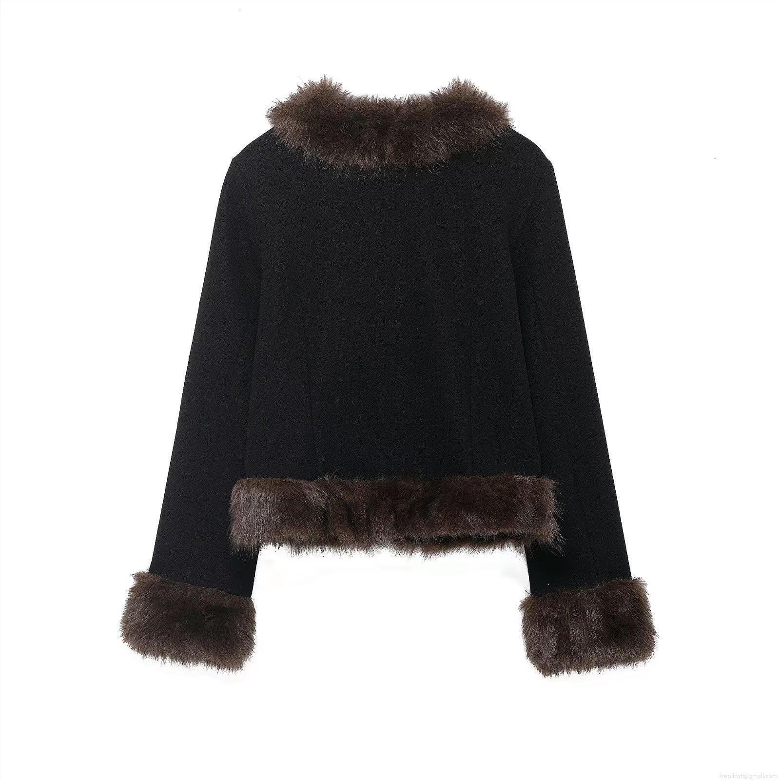 Women's Short Faux Fur Patchwork V-Neck Jacket Slim Fit Polyester Warm Coat Winter Streetwear Outerwear