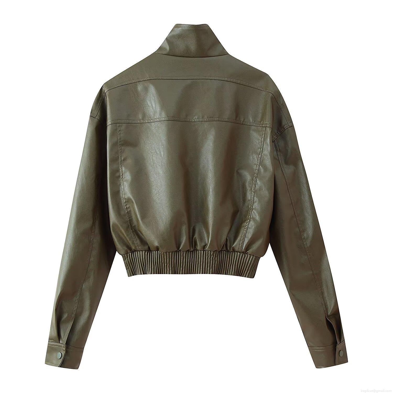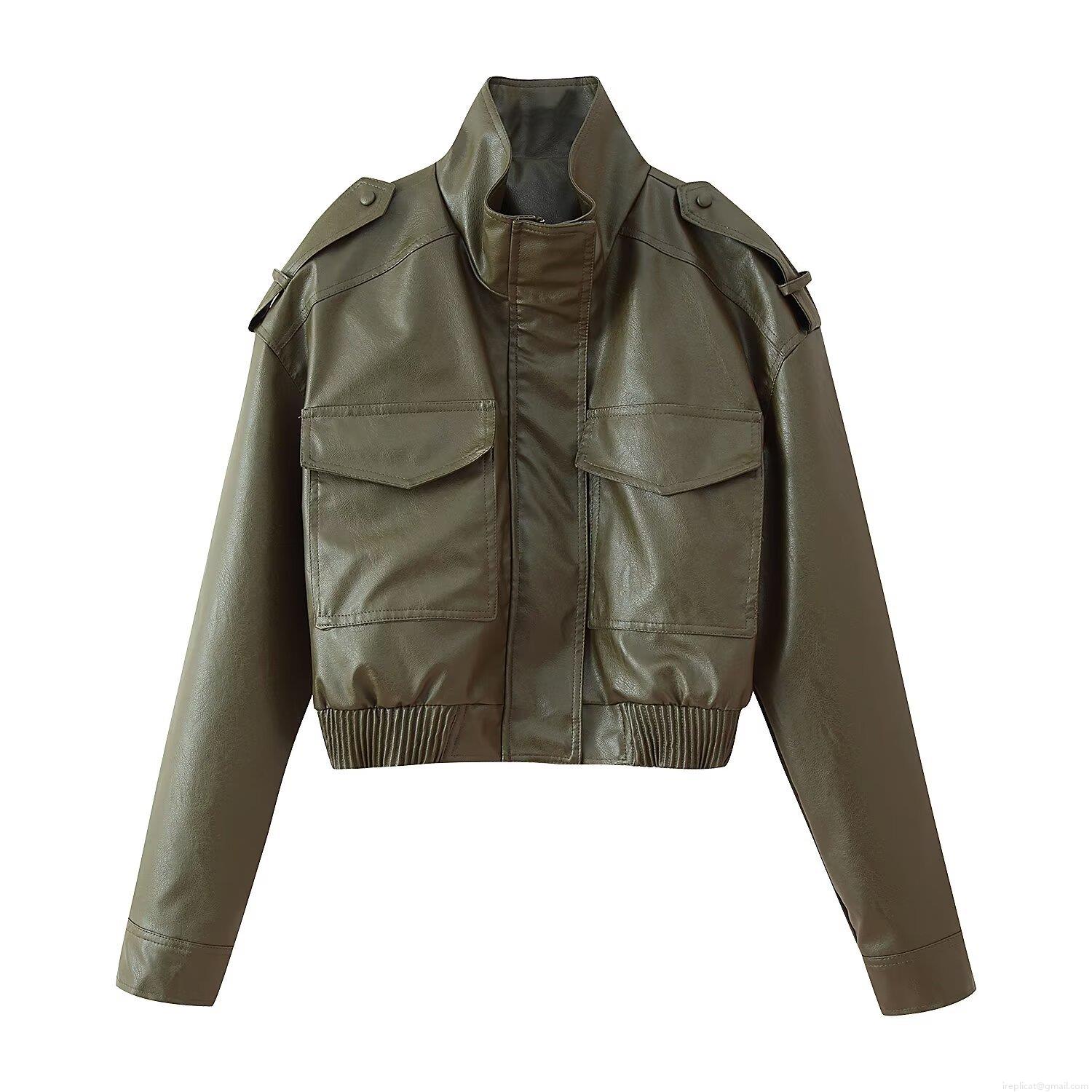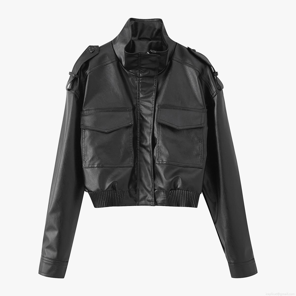 • Women's Short PU Leather Jacket Stand Collar Streetwear Moto Biker Coats With Large Pockets Shoulder Straps Zip-Up Outerwear For Autumn Winter