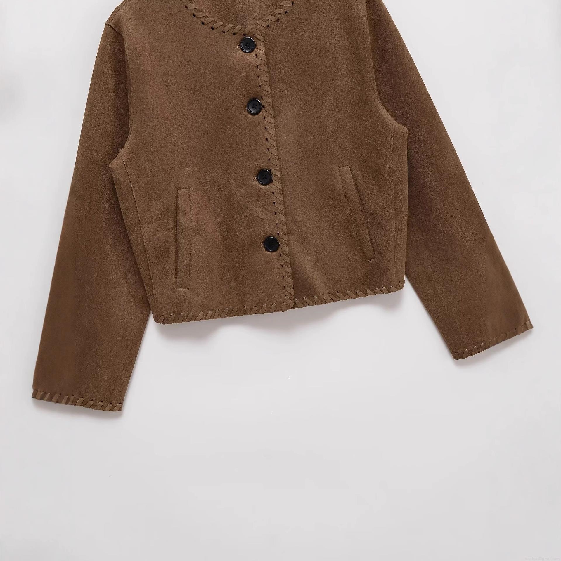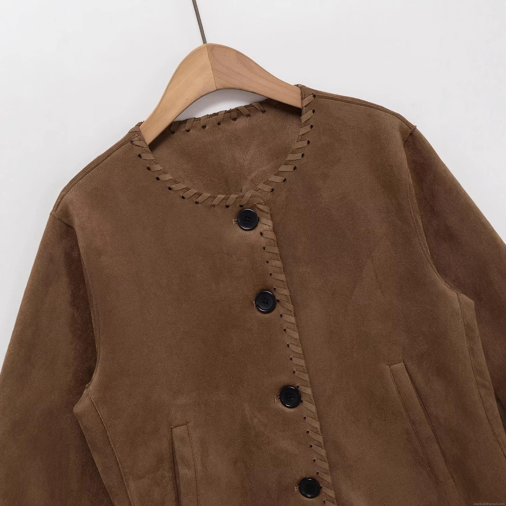 • Women's Short Suede Jacket Outerwear With Braided Trim Detail Round Neck Single Breasted Solid Color Fashion Casual Coats For Women Ladies