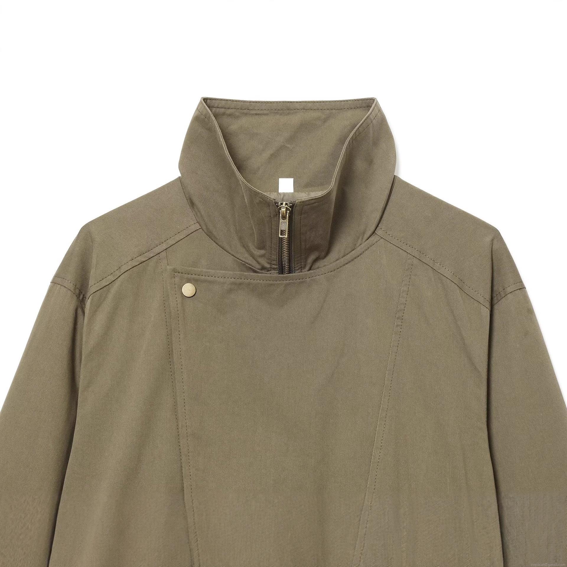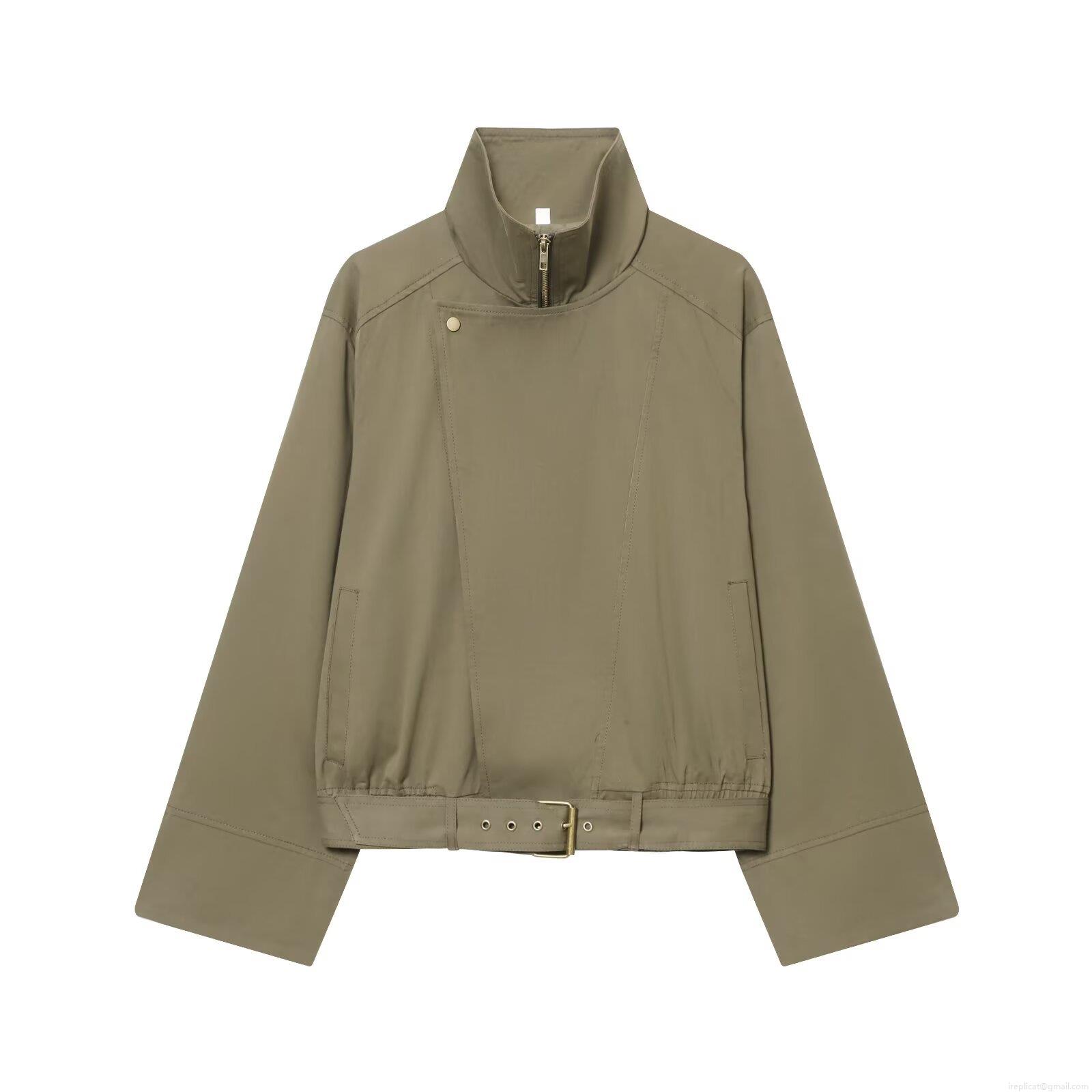 Solid Color, Belt Decoration, Metal Zipper, Stand-up Collar Design, Asymmetrical Front