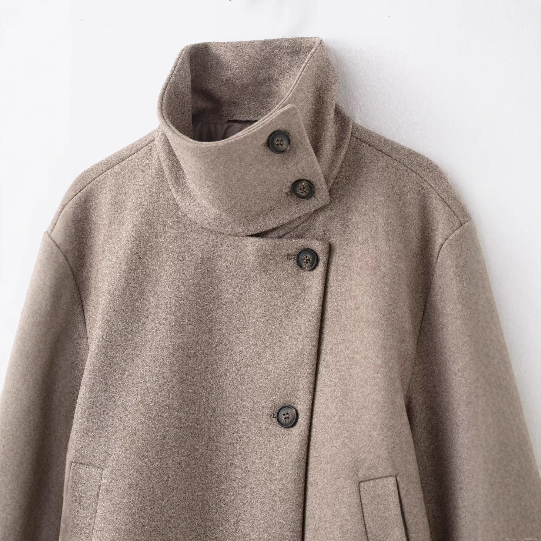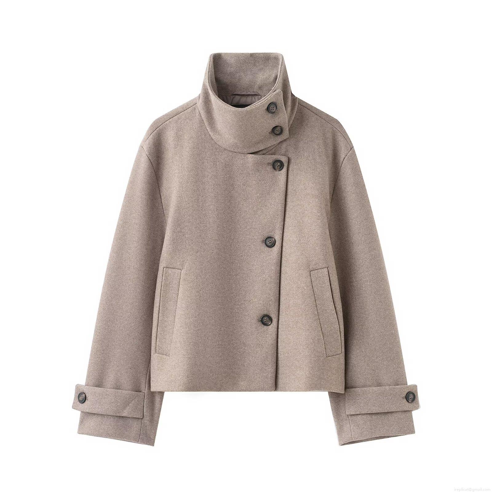 • Women's Short Woolen Jacket Elegant Stand Collar Asymmetric Button Up Coat Fall Winter Warm Solid Color Outerwear for Daily Office Lady