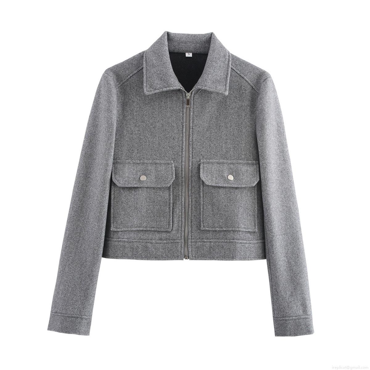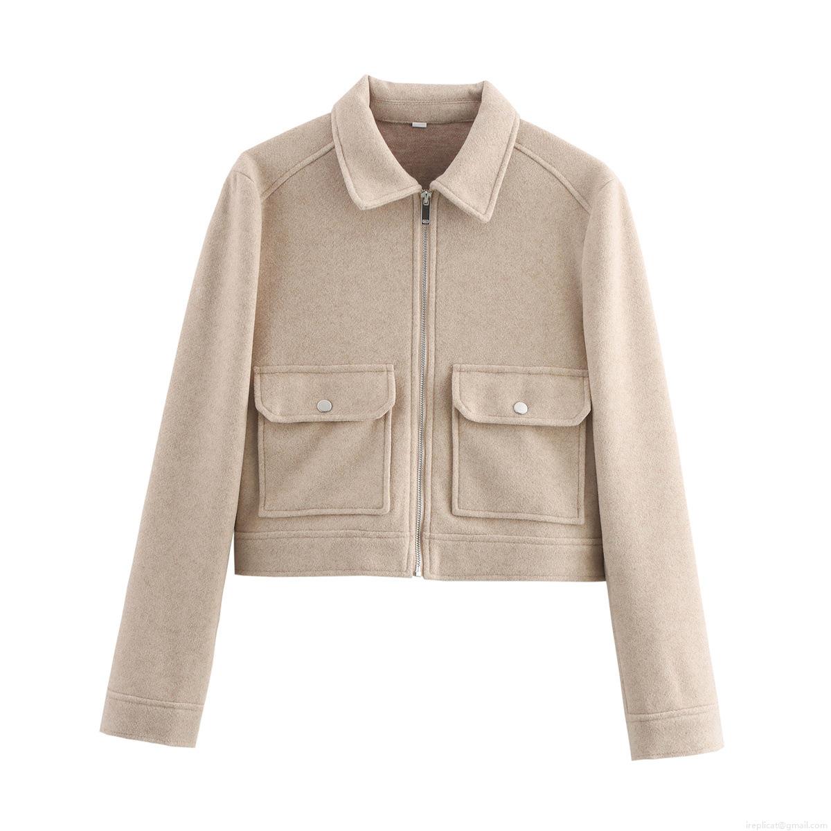 • Women's Short Woolen Texture Jacket Coat Zipper Front Turndown Collar Solid Color Casual Outerwear With Pockets For Autumn Winter