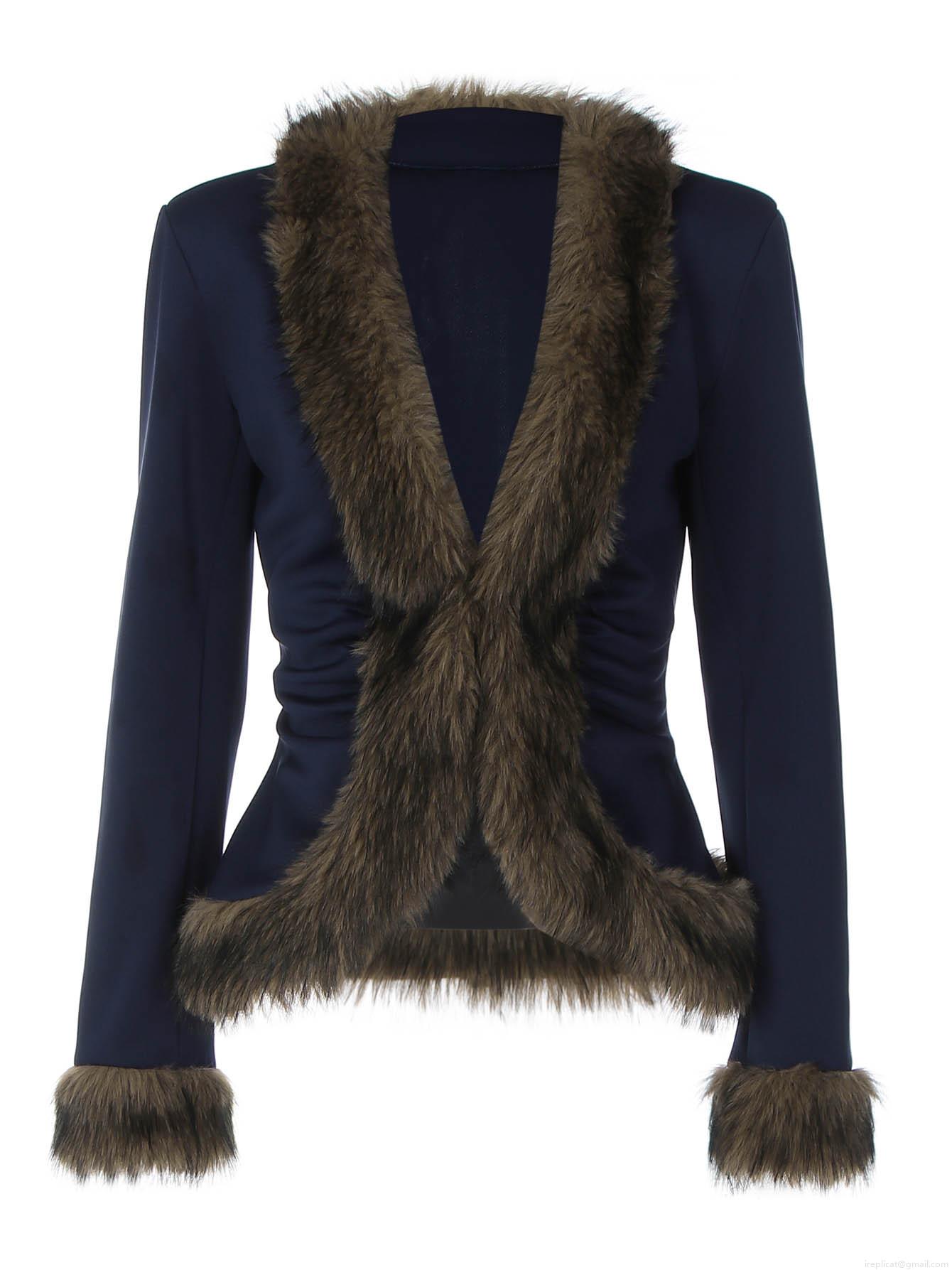 • Women's Slim Fit Navy Blue Jacket With Brown Faux Fur Trim Vintage Street Style V-Neck Long Sleeve Patchwork Outerwear Coats For Women