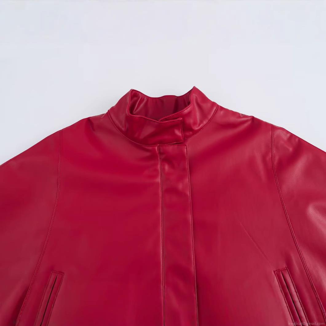 Women's Solid Red PU Leather Cloak Jacket Zip Up Stand Collar Loose Poncho Outerwear Streetwear Casual Short Cape Coat For Spring Autumn
