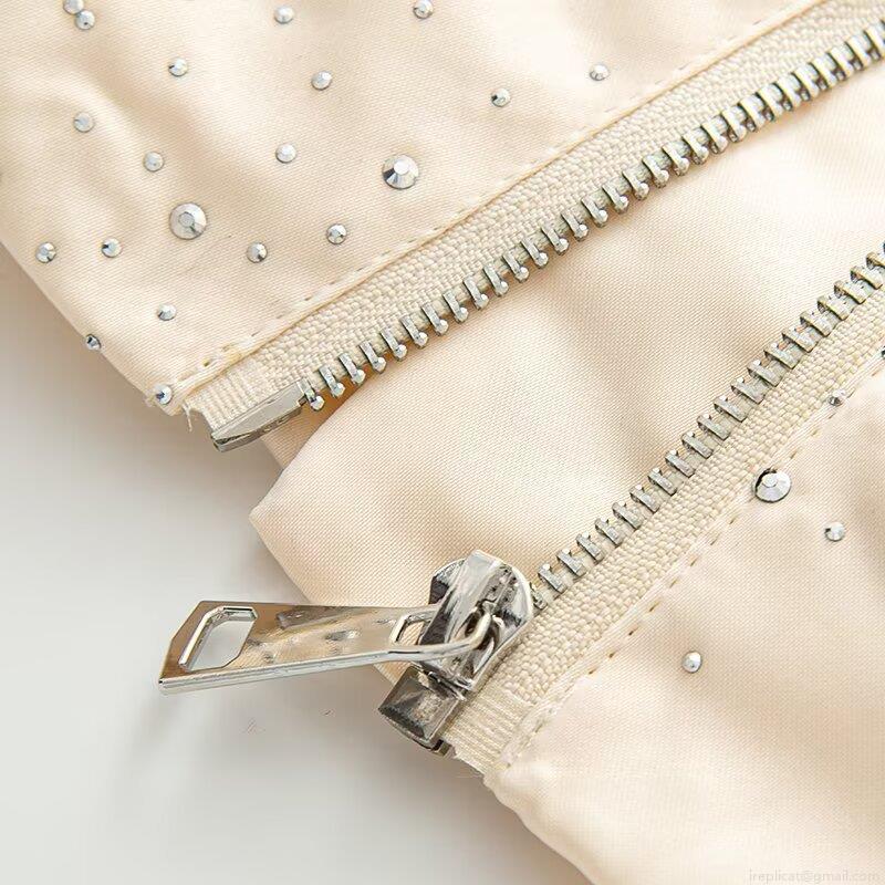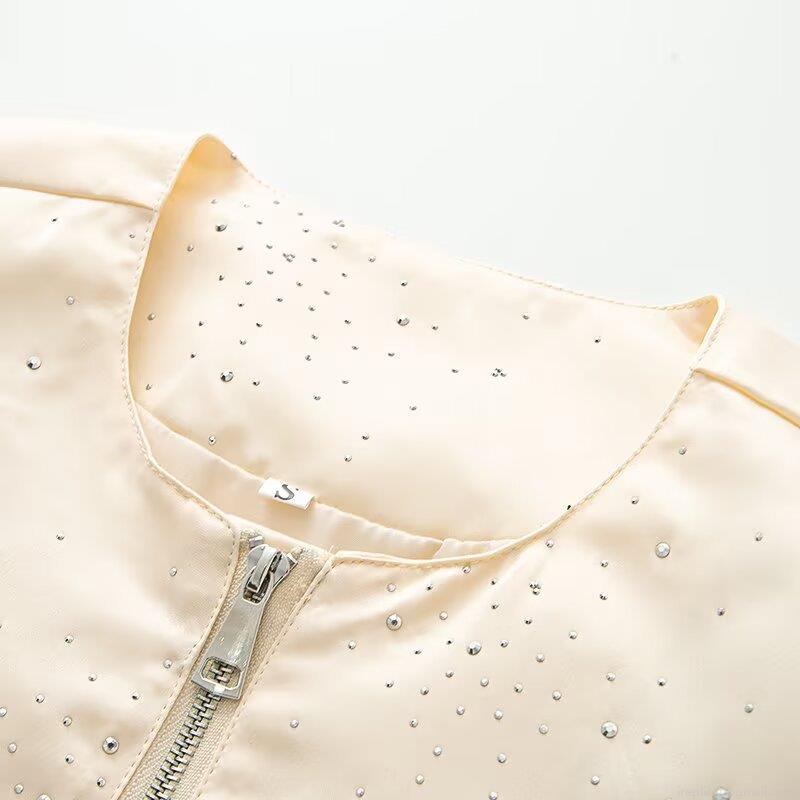 Women's Sparkling Rhinestone Baseball Jacket Luxury 100% Polyester Circular Neck Long Sleeve Zip Up Bomber Jacket Casual Loose Autumn Outerwear Streetwear Beige