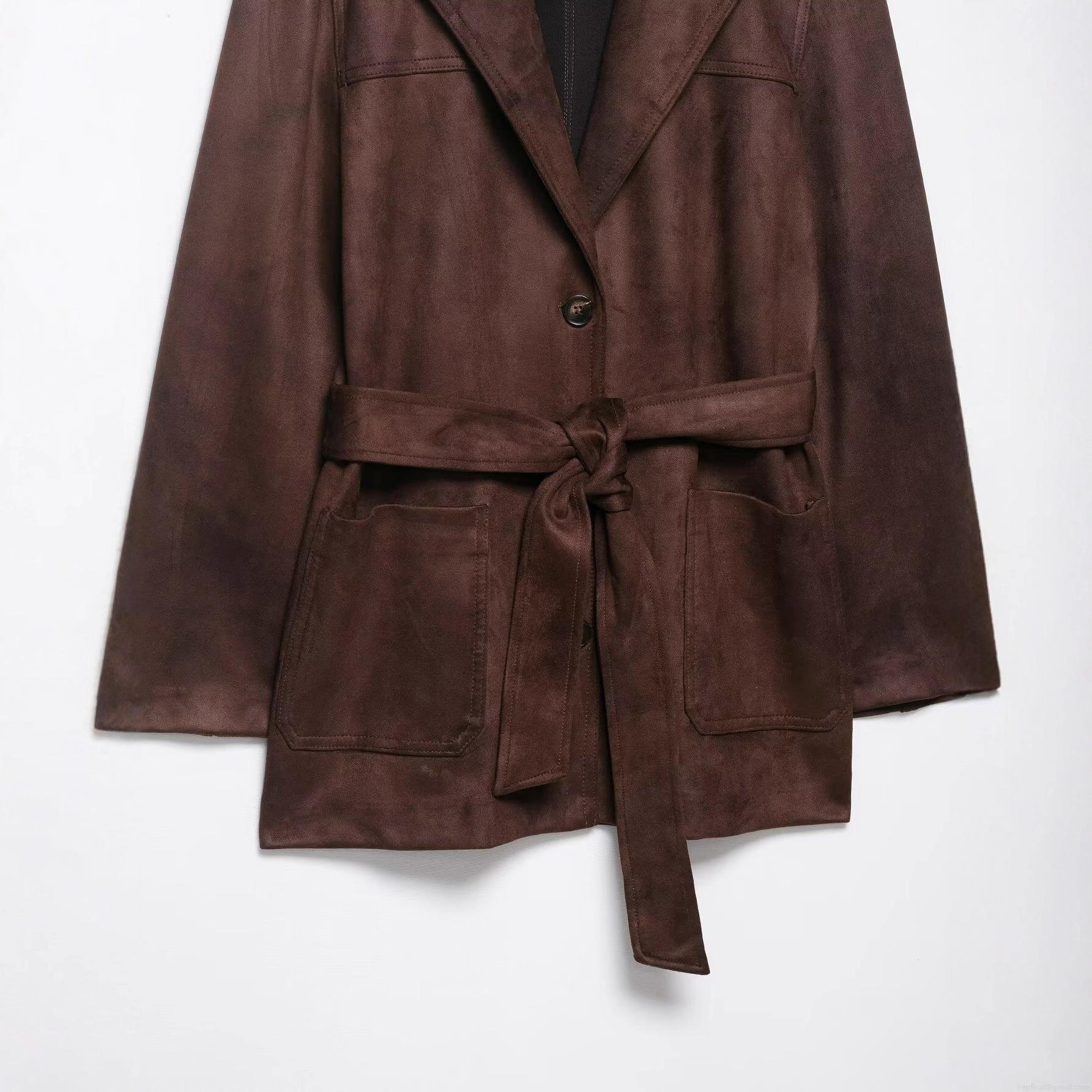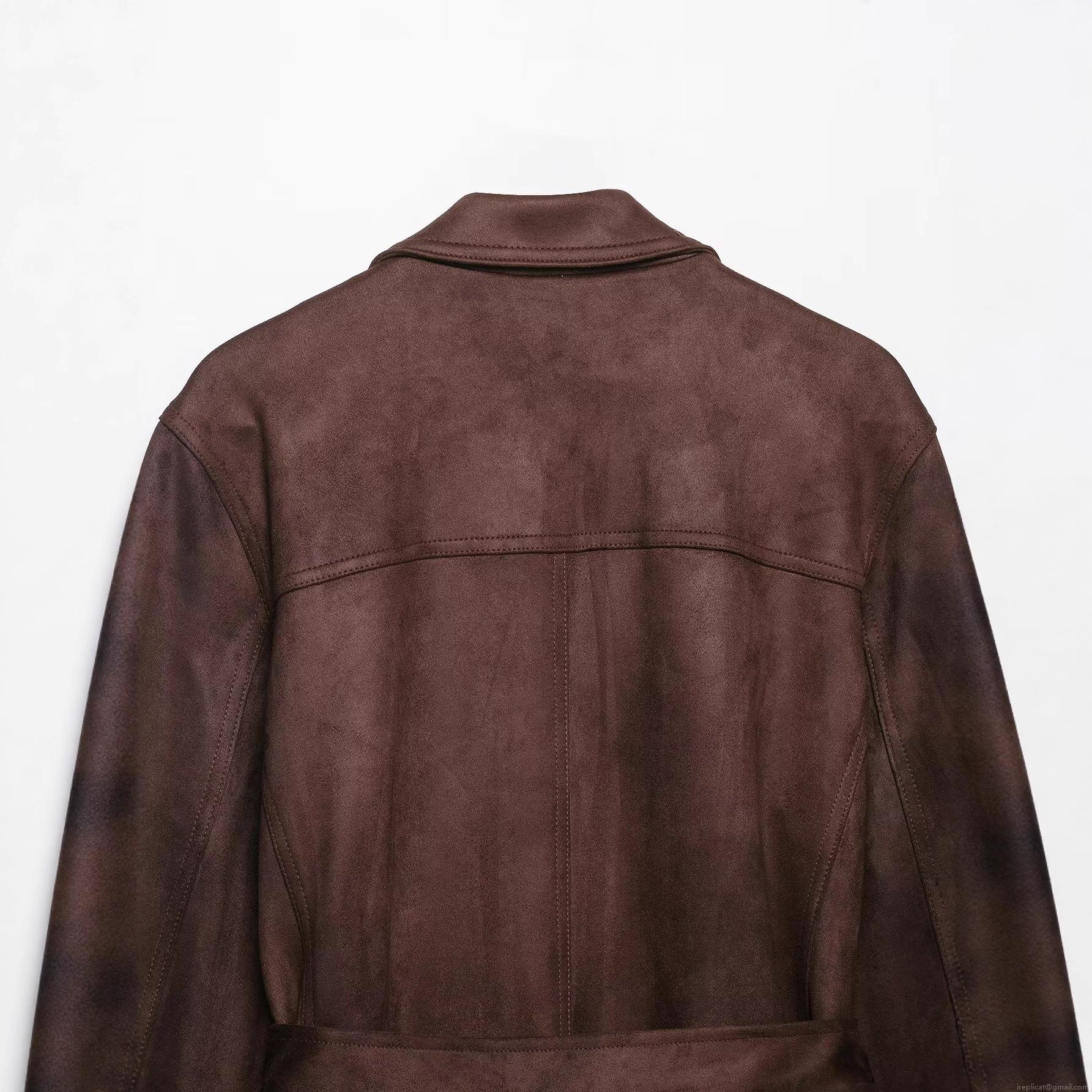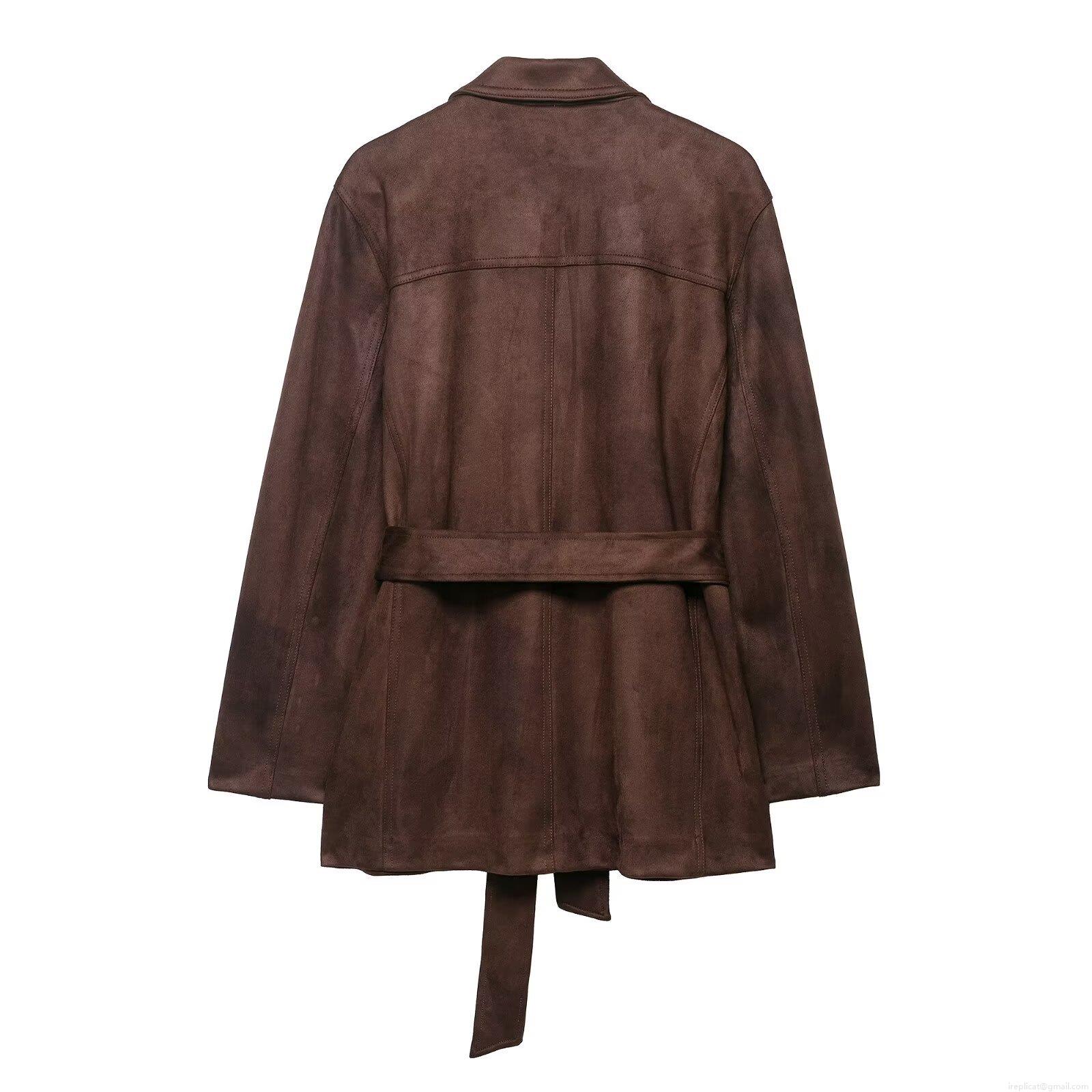Women's Suede Belted Jacket Elegant Long Sleeve Lapel Coat Autumn Solid Color Slim Outerwear With Pockets For Women