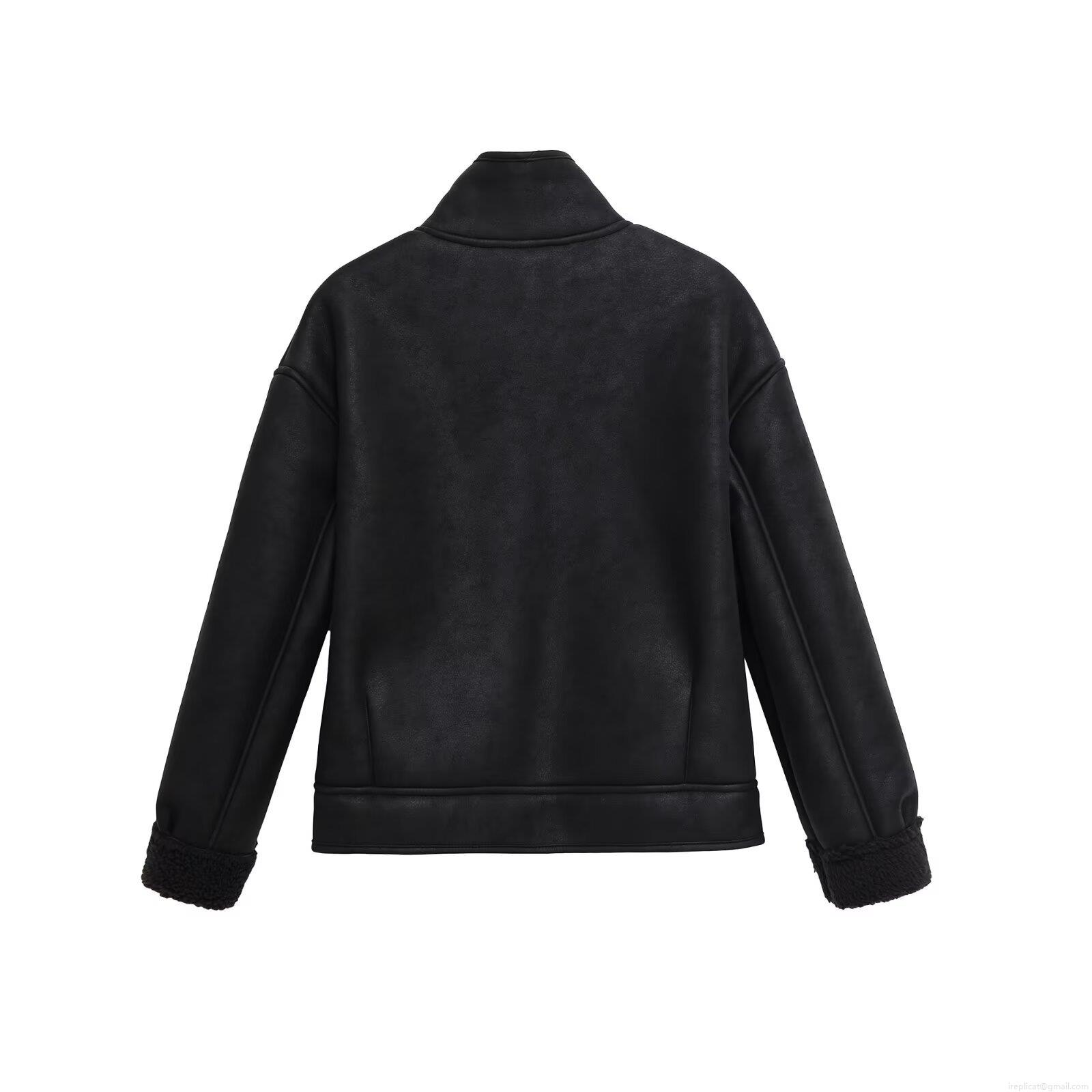 Women's Suede Effect Faux Fur Lined Short Jacket Stand Collar Lamb Wool Trim Single Breasted Casual Outerwear Coat Fashion Streetwear