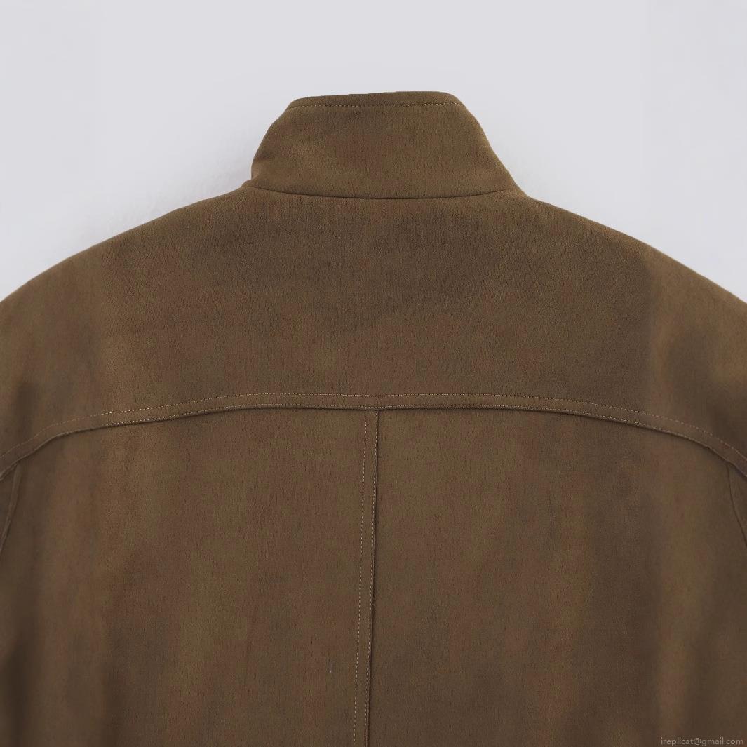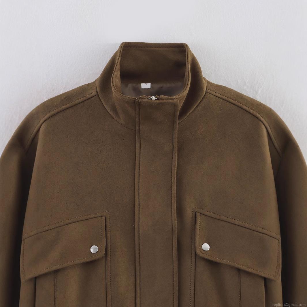 • Women's Suede Fabric Jacket Short Stand Collar Solid Coffee Brown Zip Up Utilitarian Cargo Outerwear With Metal Buttons Long Sleeve For Autumn Winter Spring Fashion Casual Coat