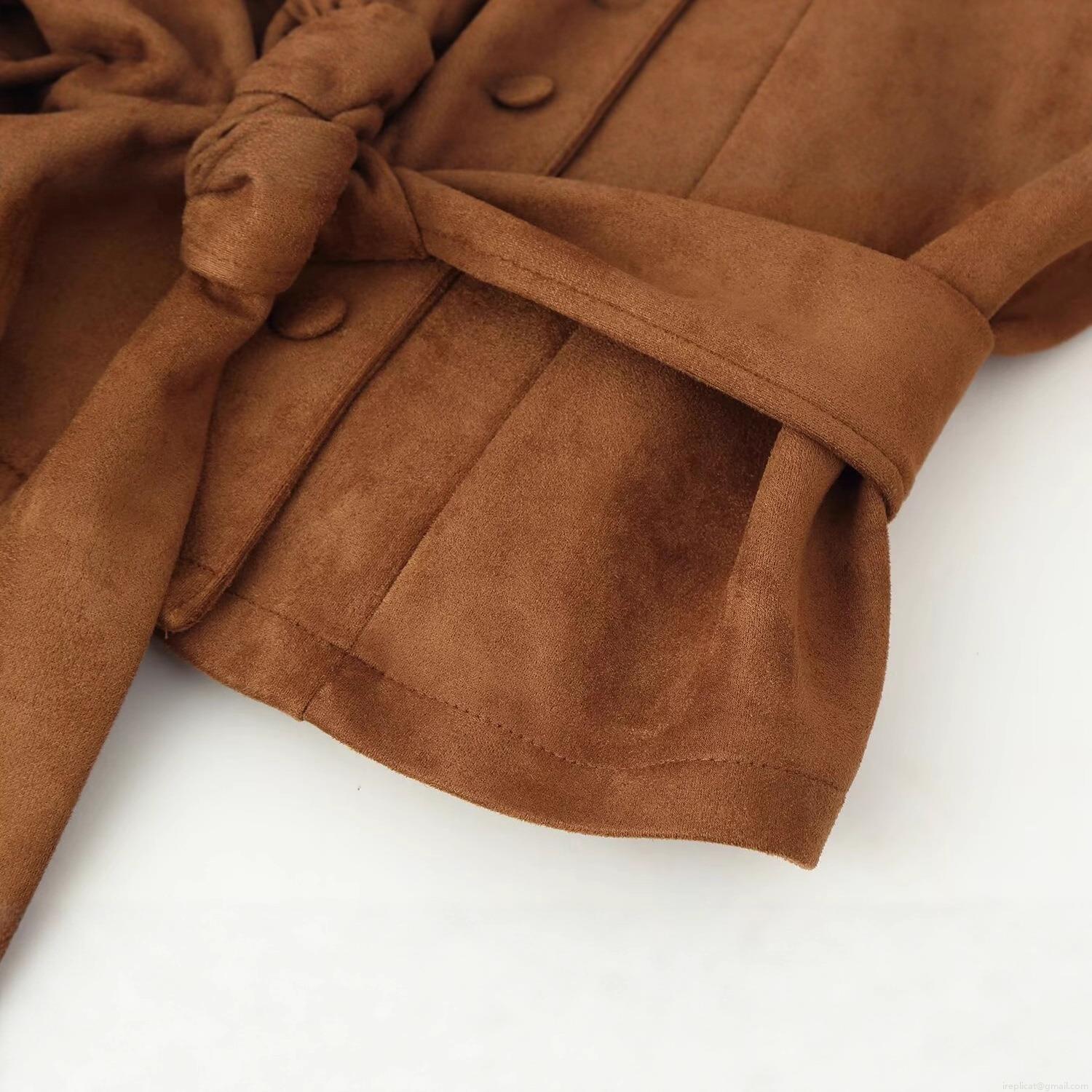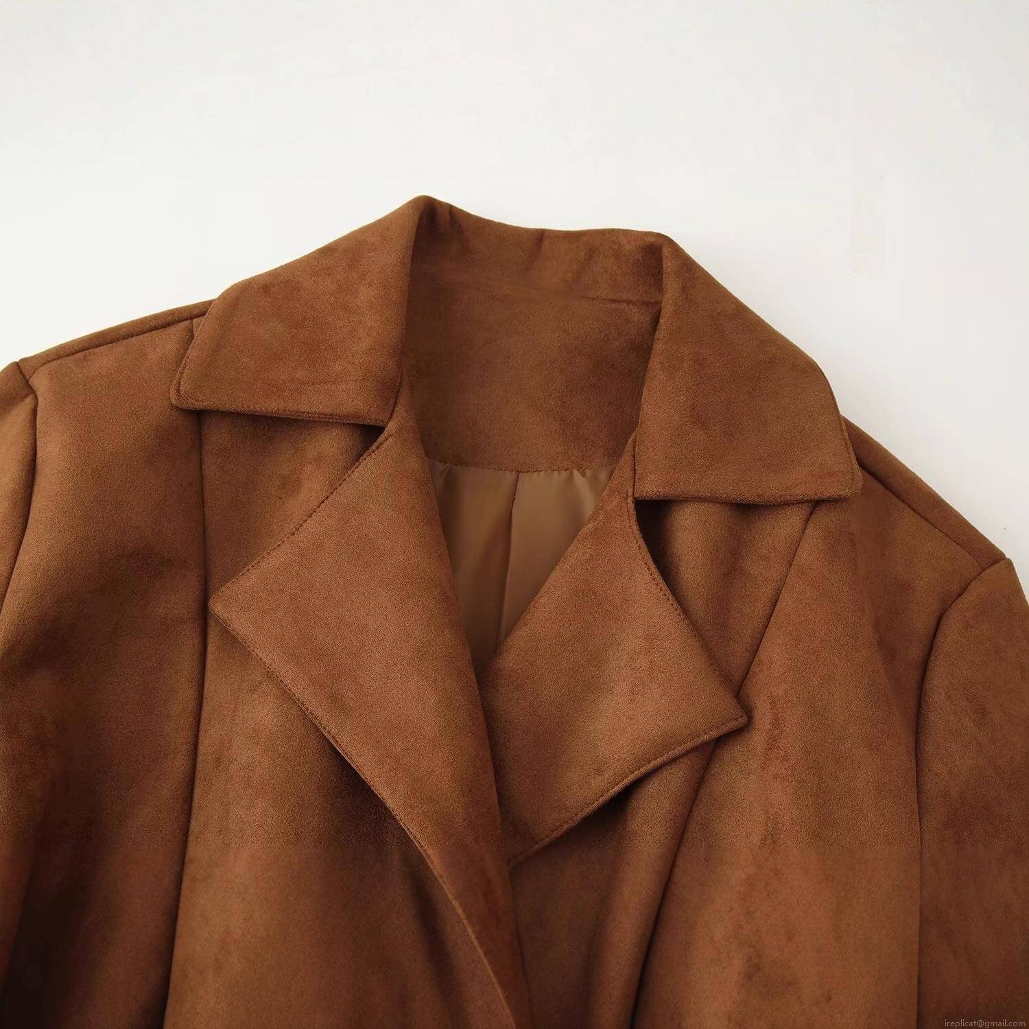 Women's Suede Jacket Double Breasted Belt Lapel Collar Long Sleeve Autumn Winter Streetwear Outerwear For Women Ladies Windproof Short Coat