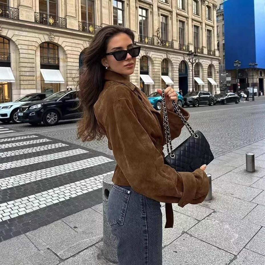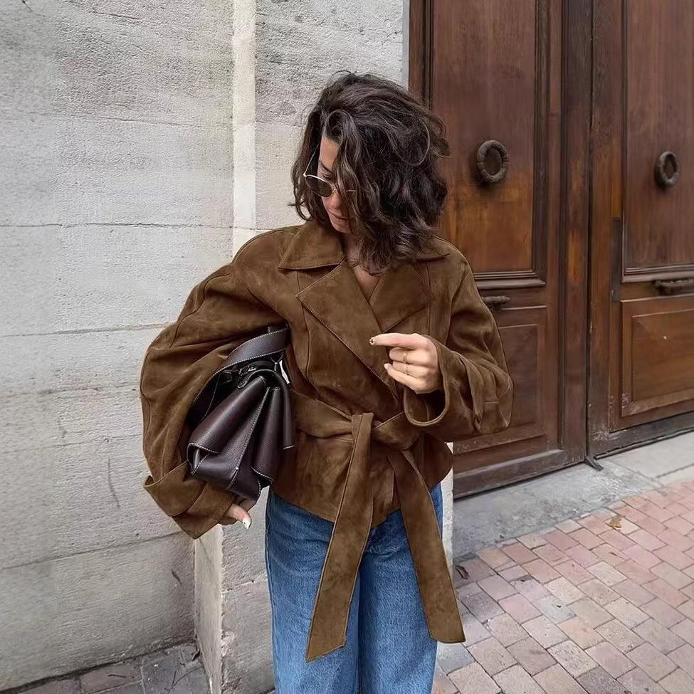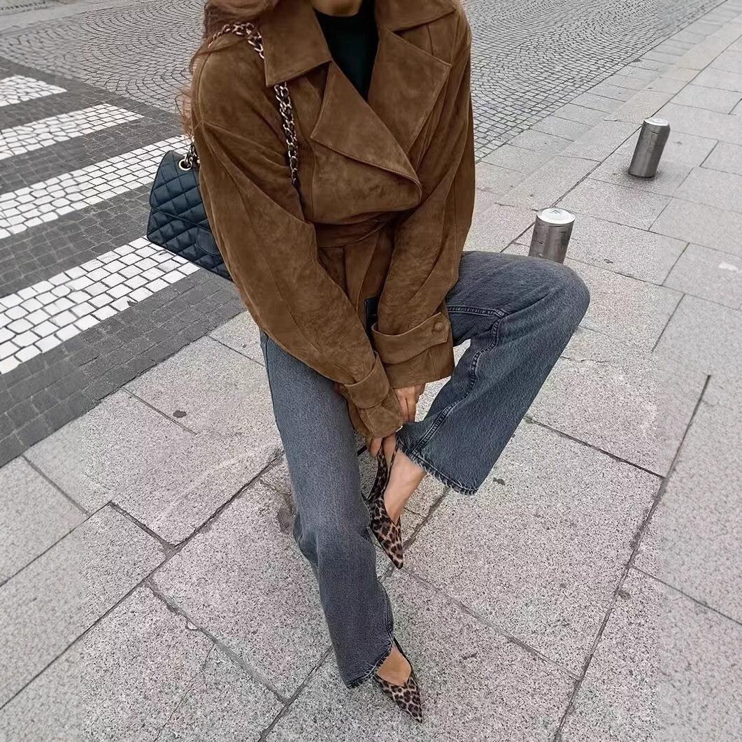 Women's Suede Short Jacket Double Breasted Belted Trench Coat British Style Lapel Autumn Winter Outerwear for Ladies