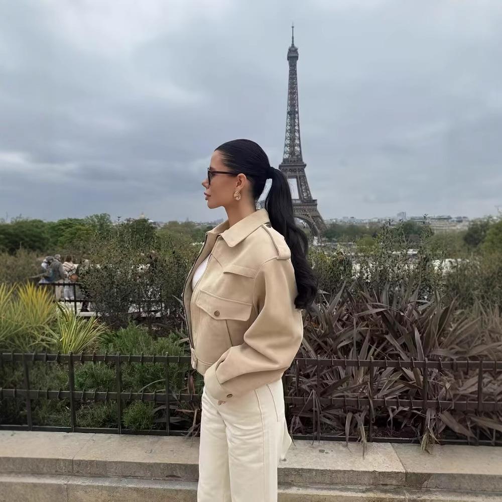 • Women's Suede Workwear Jacket Casual Lapel Zipper Short Outerwear With Flap Pockets Shoulder Straps Beige Autumn Winter Fashion Streetwear Coat