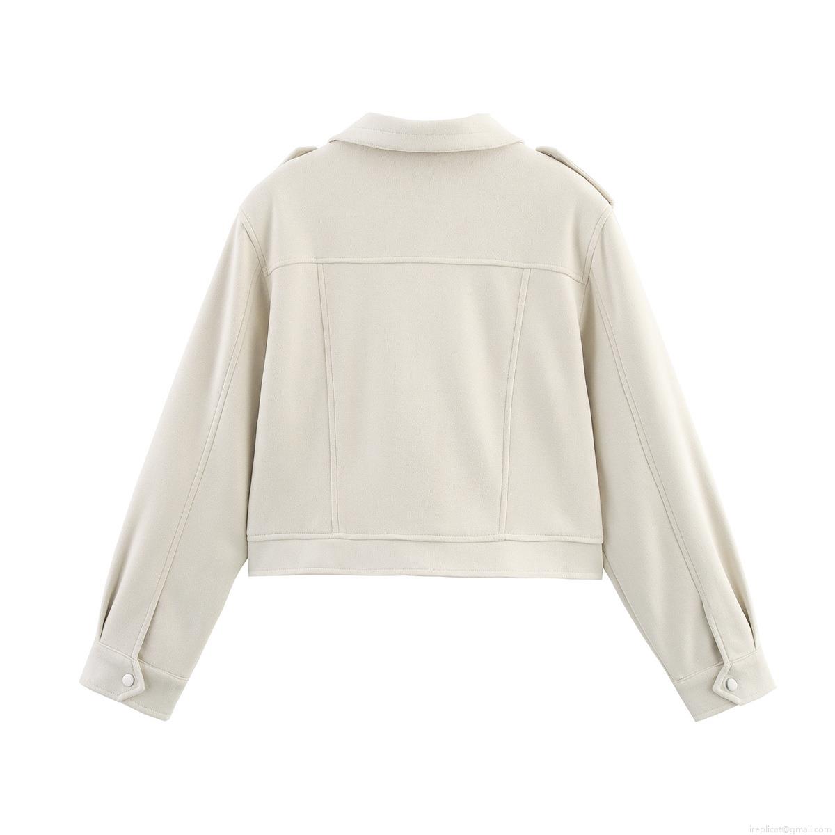 Women's Suede Workwear Jacket Casual Lapel Zipper Short Outerwear With Flap Pockets Shoulder Straps Beige Autumn Winter Fashion Streetwear Coat