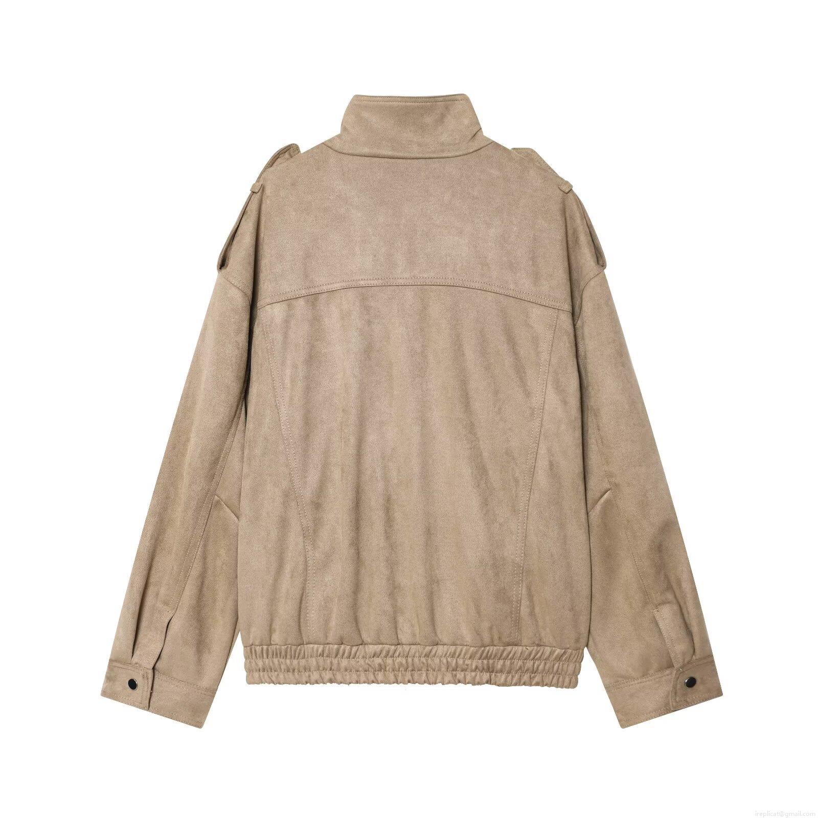 Women's Suede-like Bomber Jacket Stand Collar Shoulder Straps Zipper Long Sleeve Khaki Coat Streetwear Autumn Outerwear For Ladies