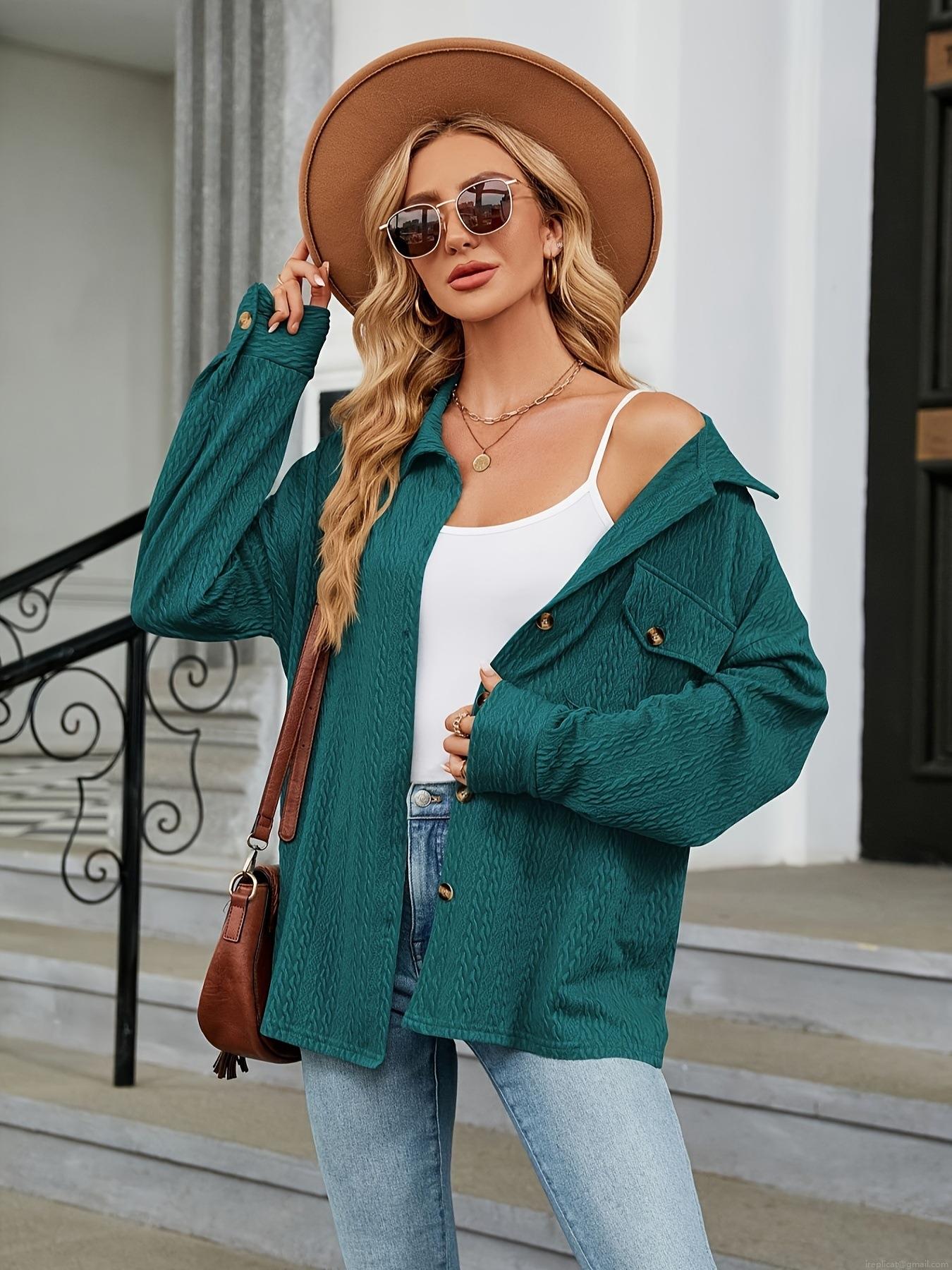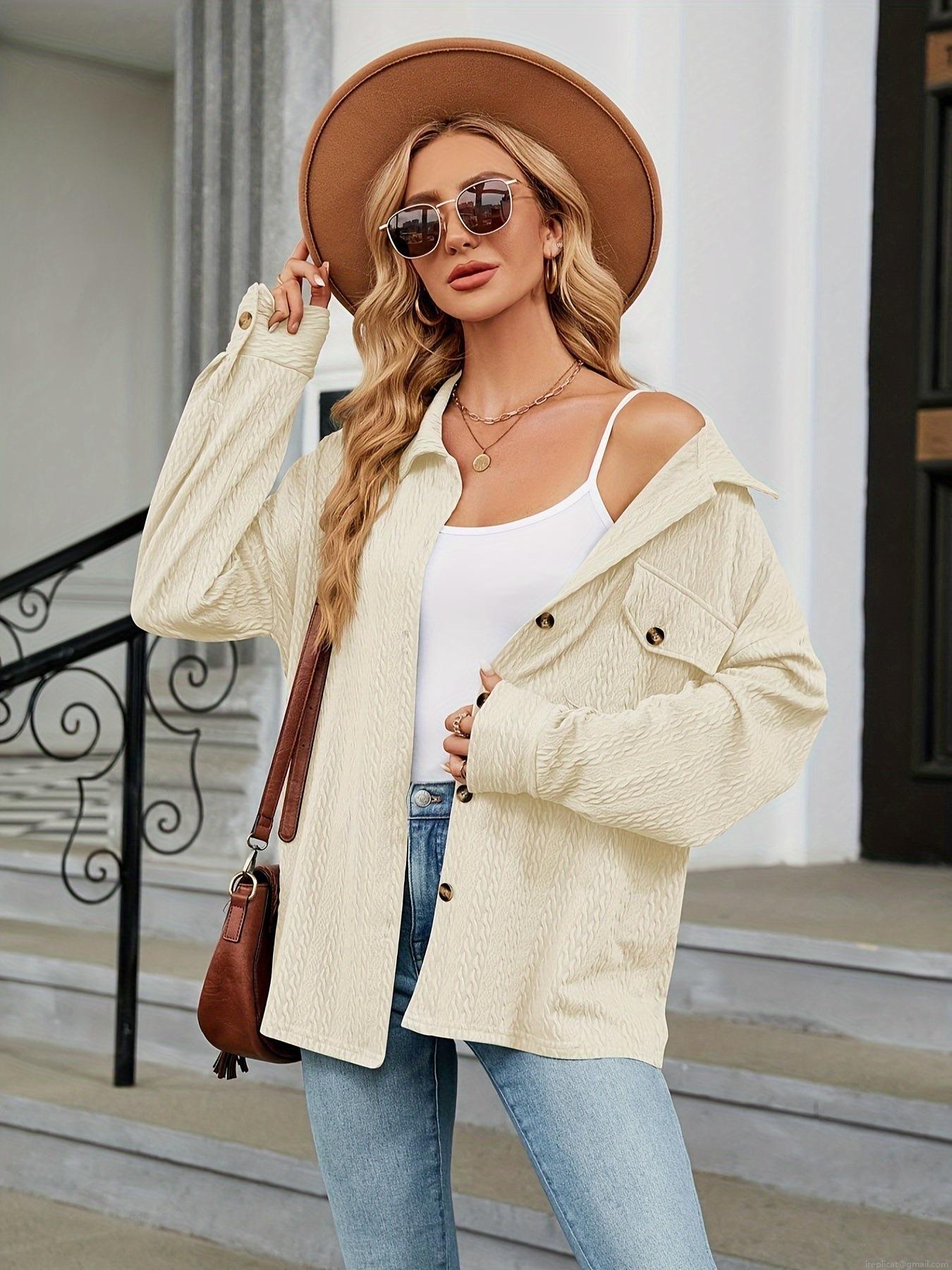 • Women's Textured Casual Button Down Shirt Jacket Solid Color Long Sleeve Coat With Pockets Turn-down Collar Autumn Winter Outerwear Fashion Top