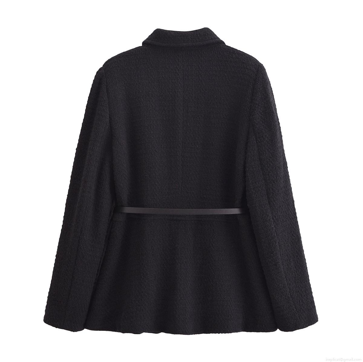 Women's Tweed Jacket With Belt Elegant Solid Black Long Sleeve Lapel Mid-length Winter Coat With Gold Buttons For Women Streetwear