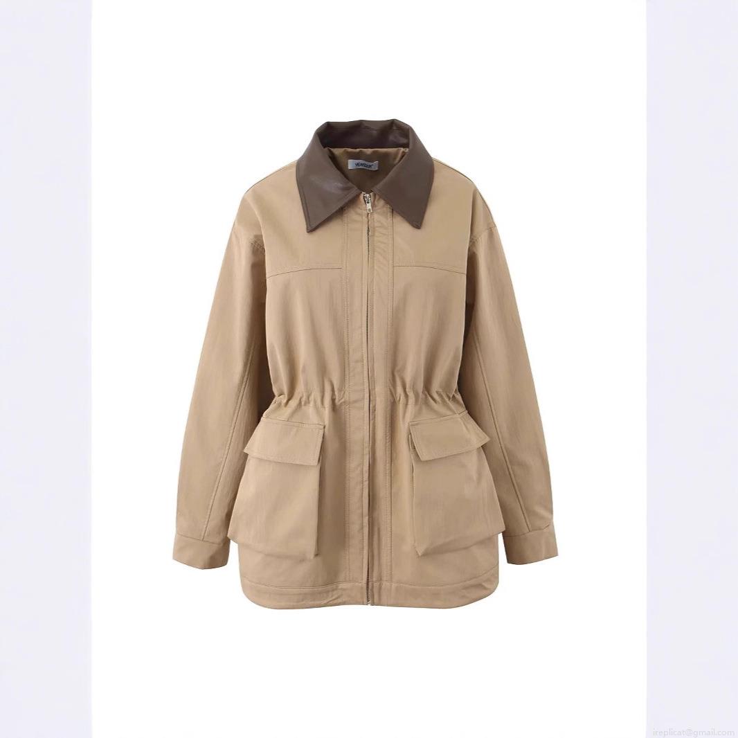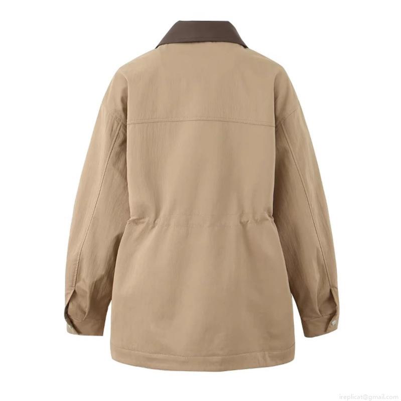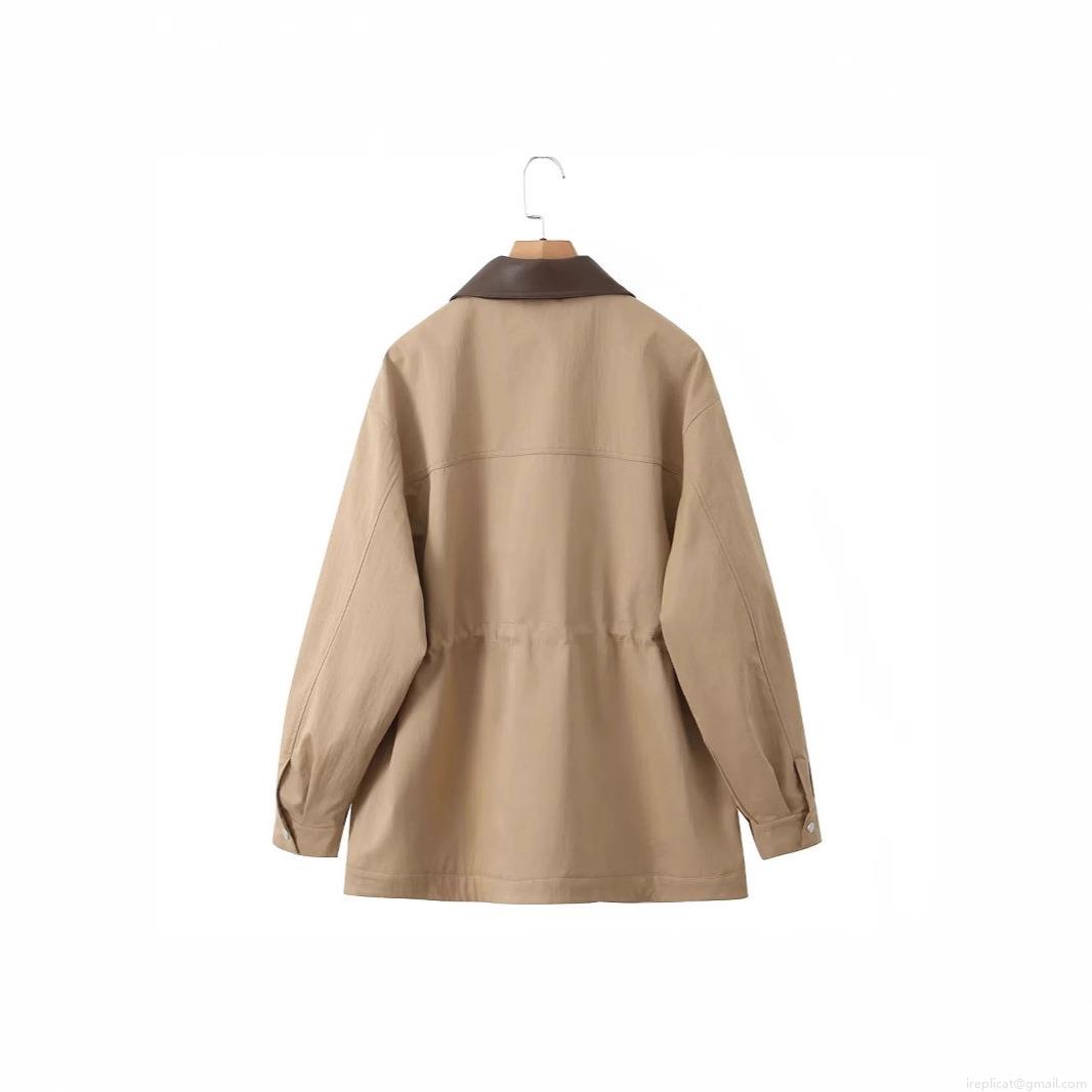 • Women's Utility Trench Coat Jacket Khaki Mid Length Loose Drawstring Waist Suede Polyester With Leather Collar Functional Outwear