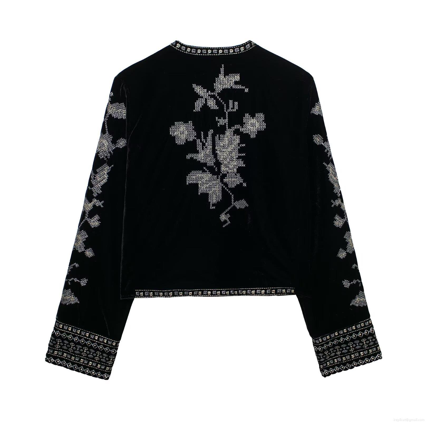 • Women's Velvet Embroidery Short Jacket Polyester Vintage Floral V-Neck Long Sleeve Zip Up Outerwear For Socialite Party Style