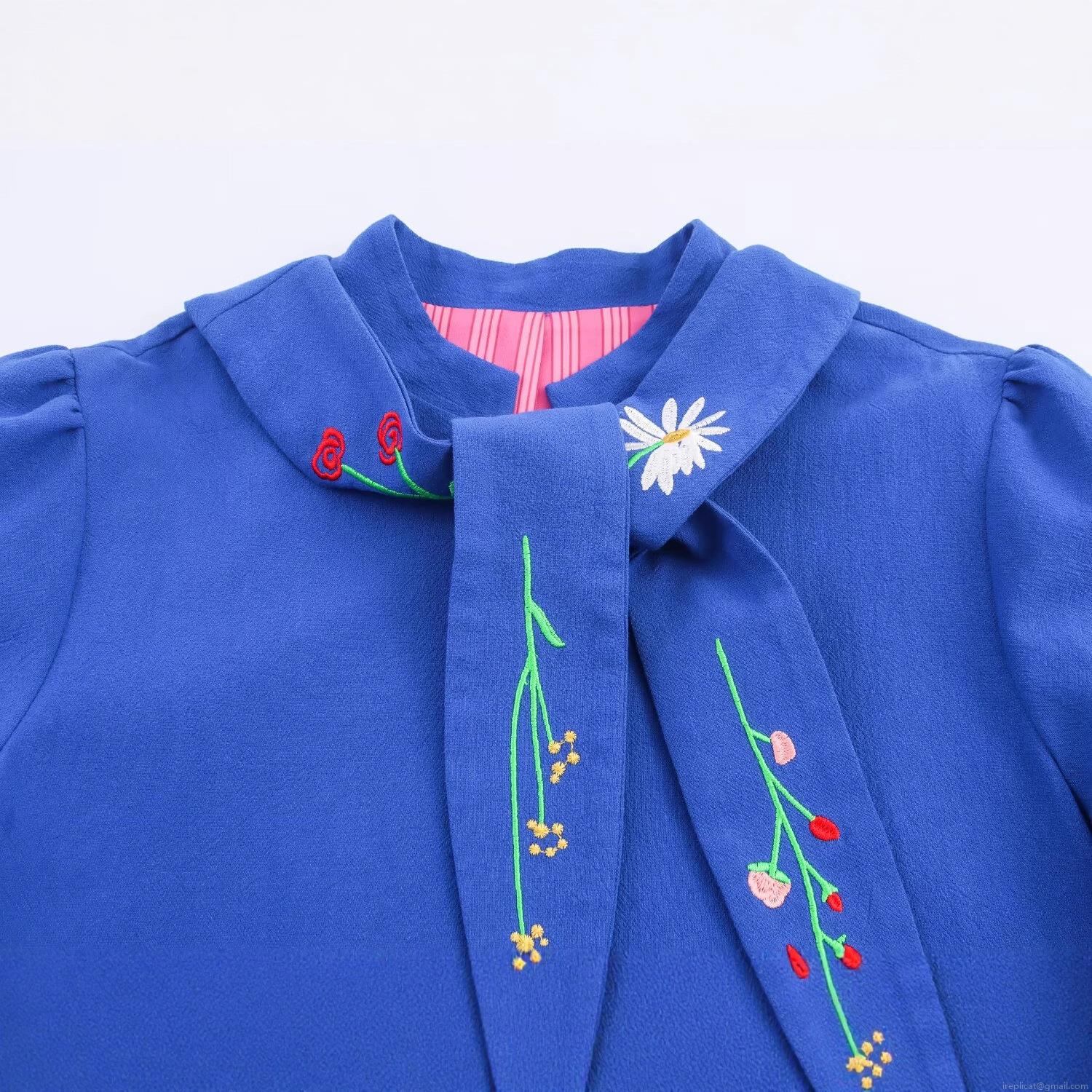Women's Vintage Blue Floral Embroidery Jacket Long Sleeve Tie-up Stand Collar Single Breasted Polyester Baseball Coat Autumn Streetwear Casual Outerwear