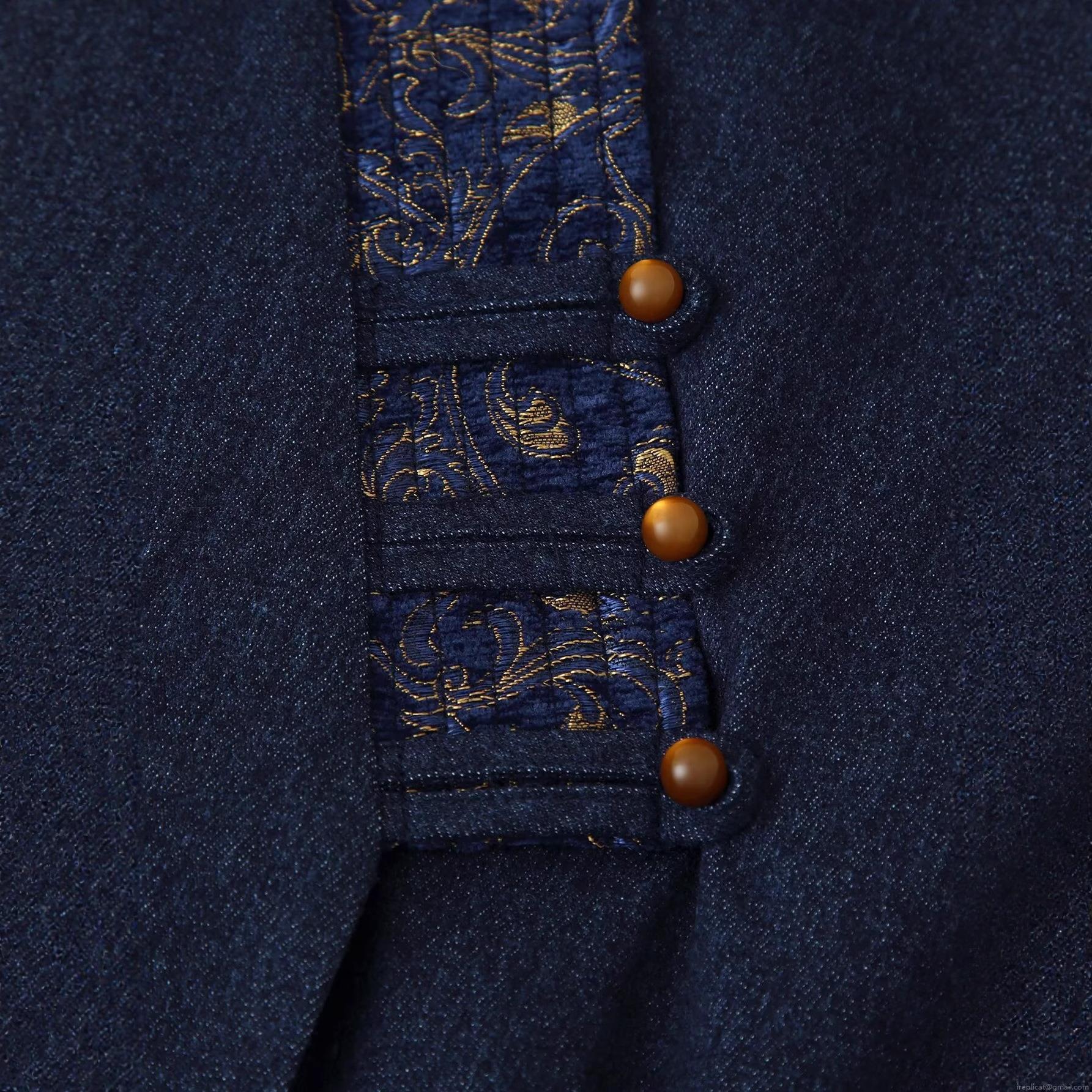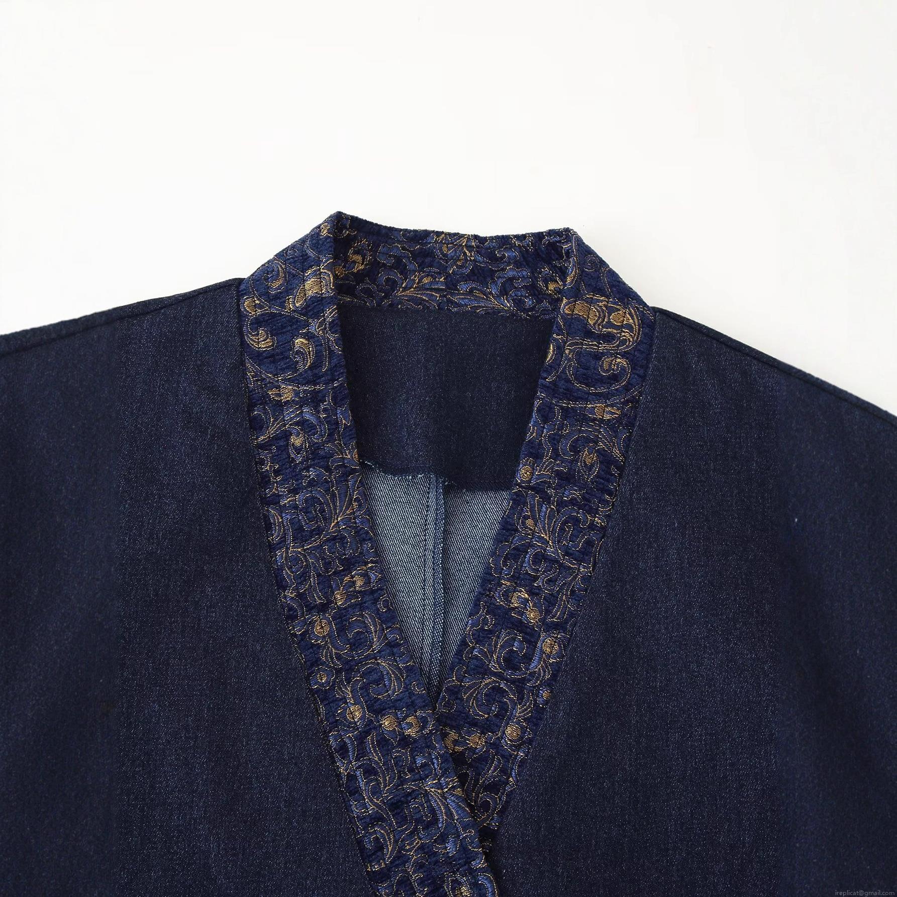 • Women's Vintage Bohemian Jacquard Denim Kimono Jacket With Gold Embroidery Cuffs Long Sleeve V-Neck Casual Loose Outerwear For Spring Autumn