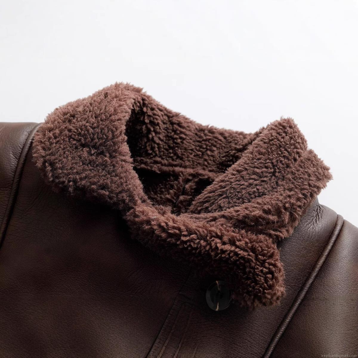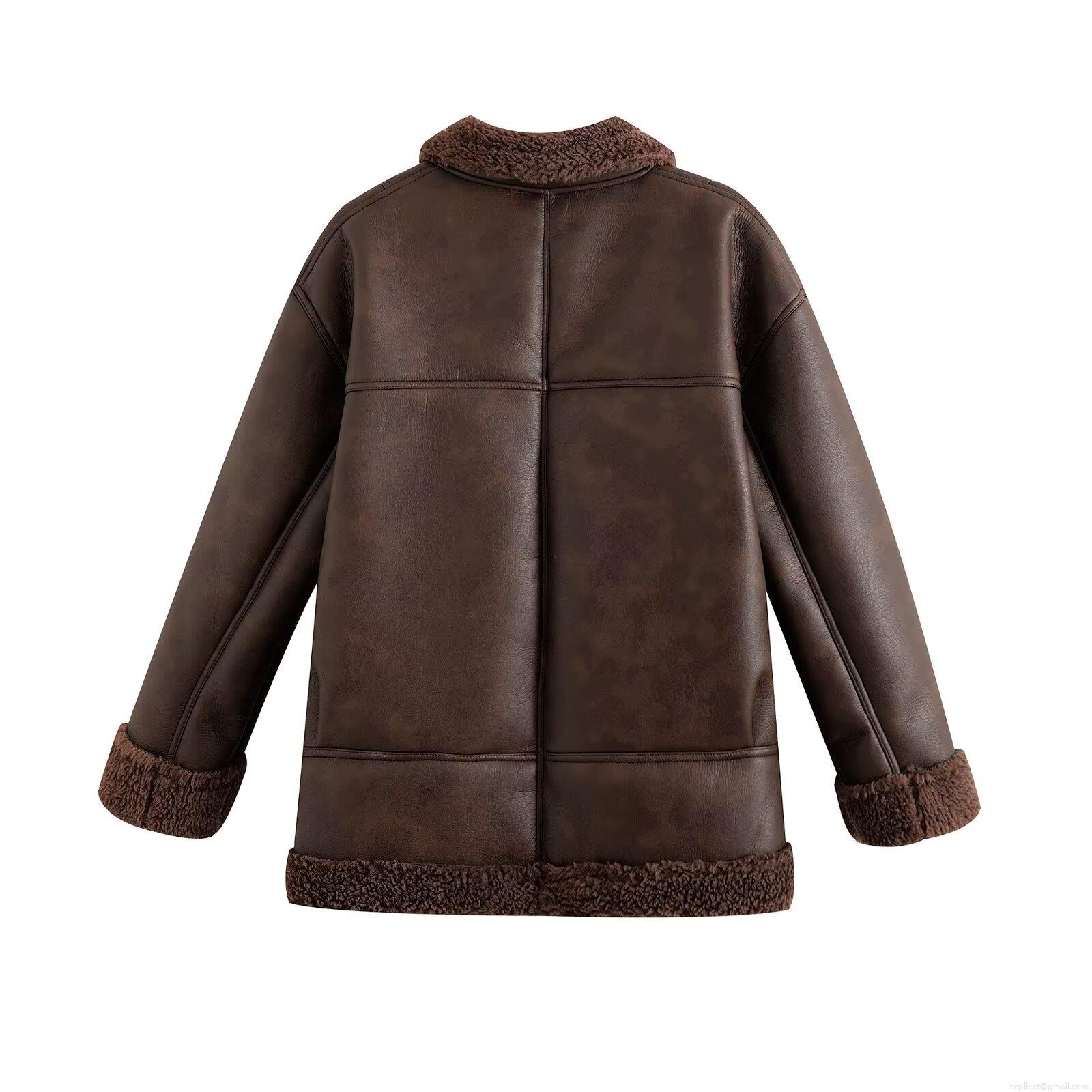 • Women's Vintage Brown Faux Leather Shearling Jacket Moto Biker Coat Winter Warm Long Sleeve Lapel Button Outwear Streetwear Fashion Coat