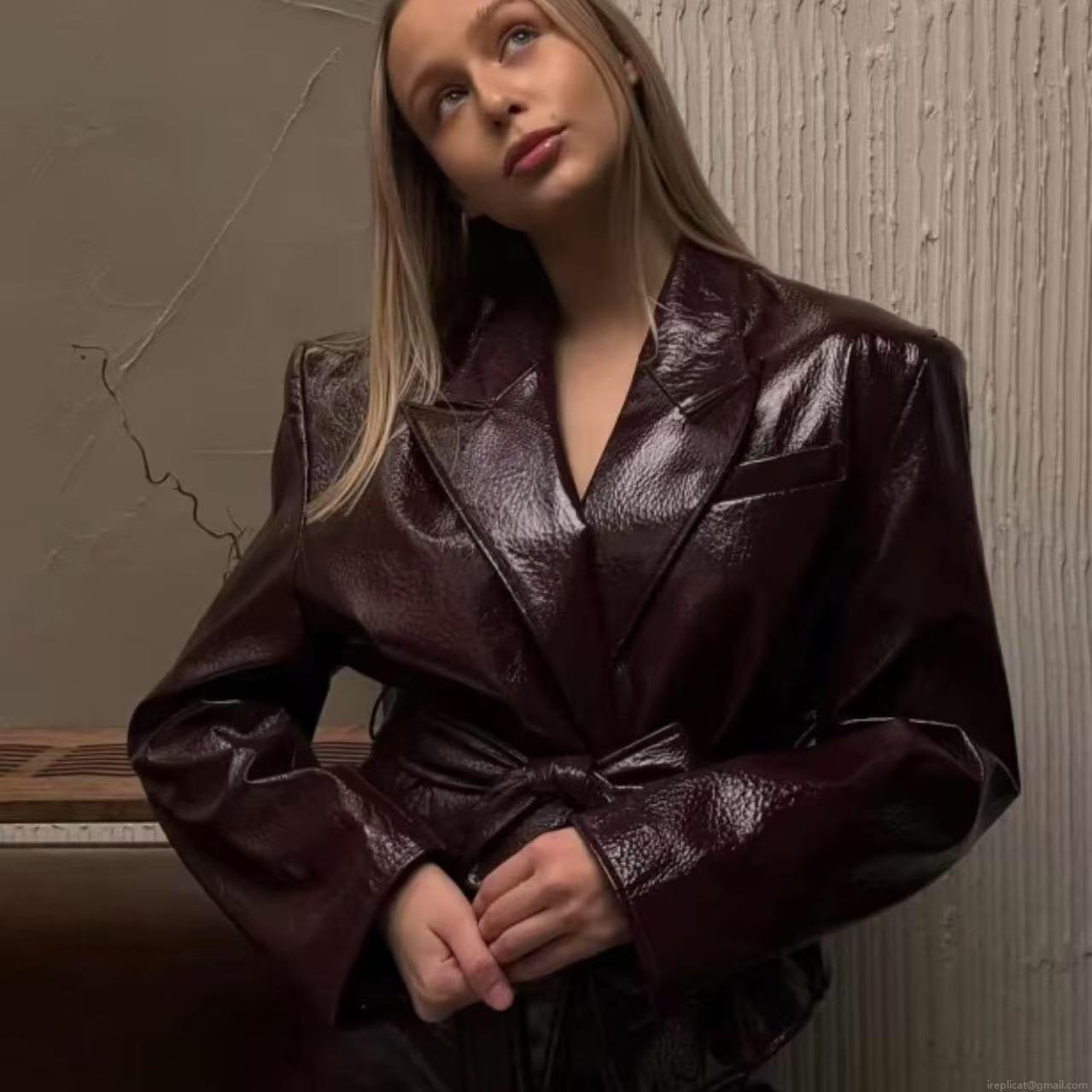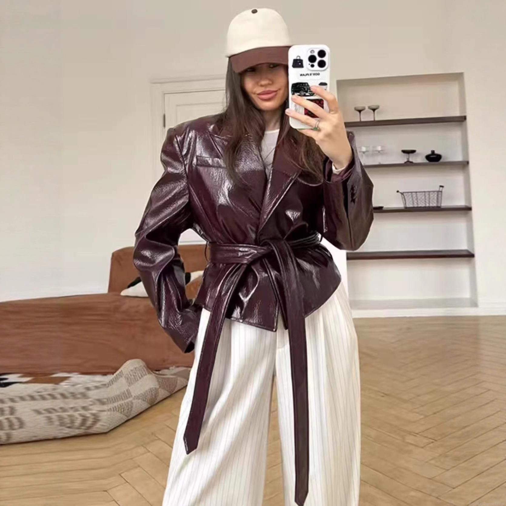 Women's Vintage Burgundy Faux Leather Jacket Lapel Long Sleeve PU Coat With Waist Belt Streetwear Chic Autumn Winter Outerwear For Ladies