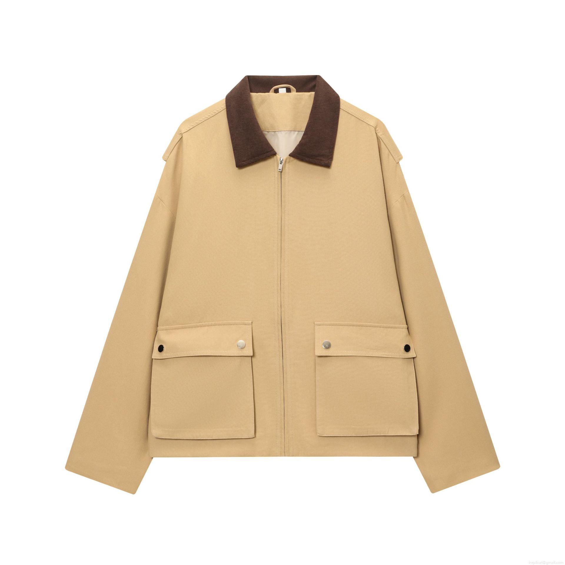 Color Blocking, Zipper Design, Large Patch, Corduroy Patchwork Collar