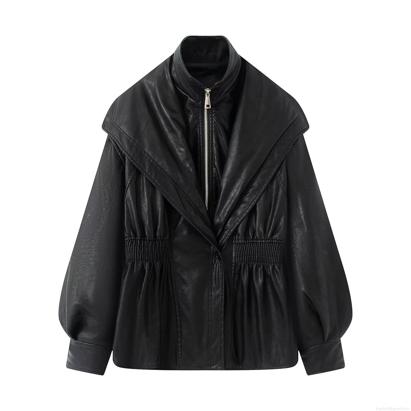 • Women's Vintage Distressed Faux Leather Jacket Chic Double Collar Zip Up PU Biker Coat With Gathered Waist And Lantern Sleeves Streetwear Outerwear