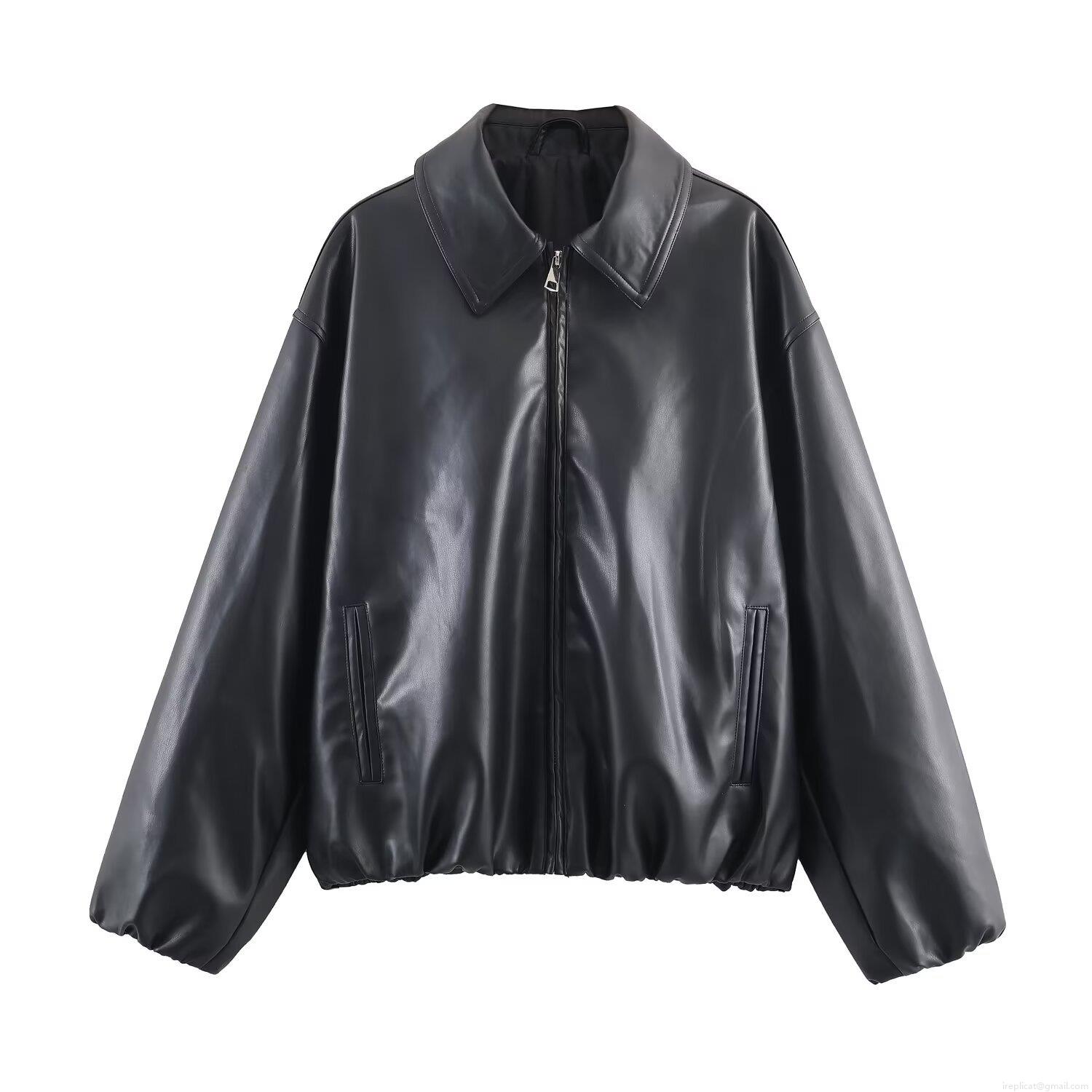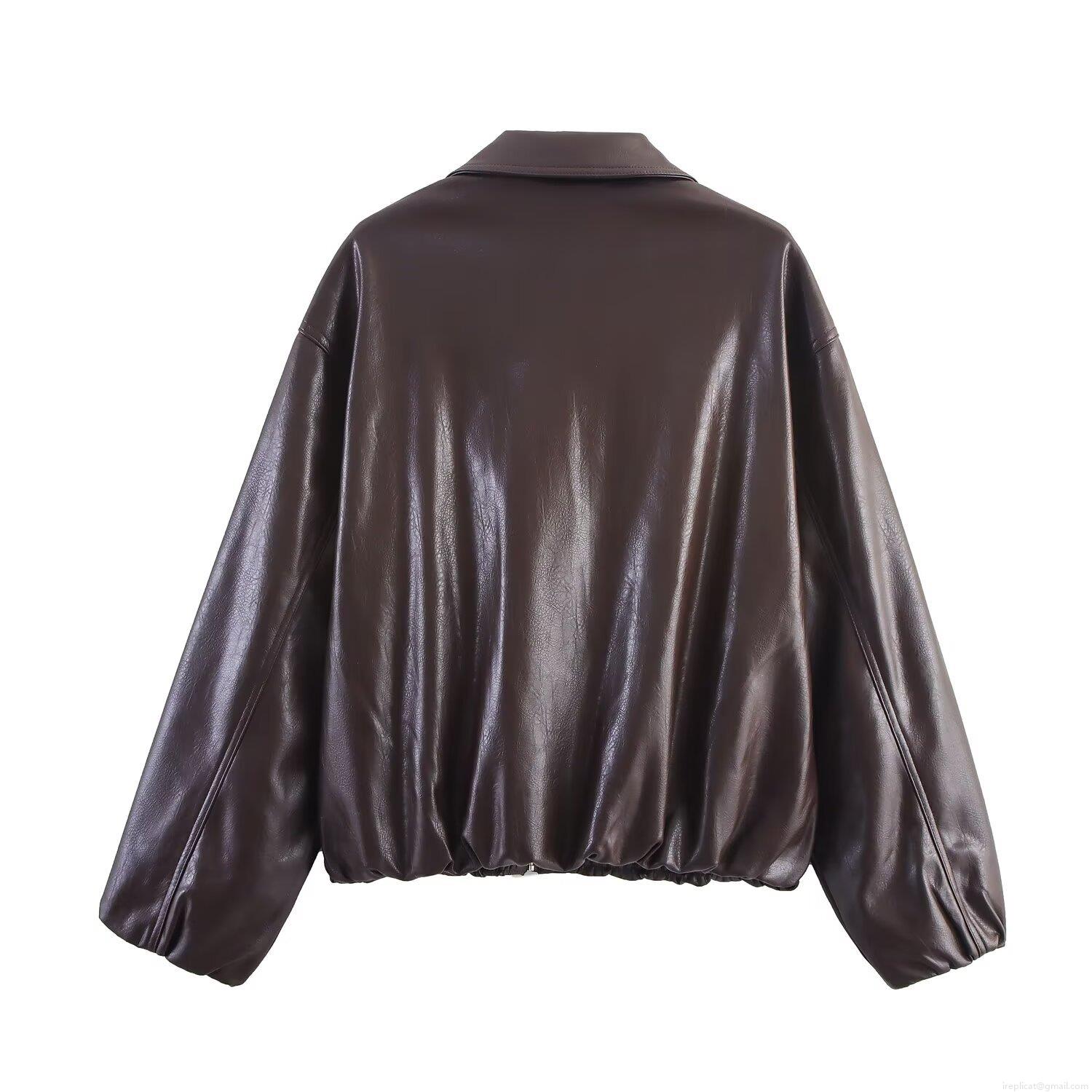 Women's Vintage Faux PU Leather Jacket With Polyester Lining Lapel Collar Zipper Closure Long Sleeve Streetwear Bomber Coat For Ladies