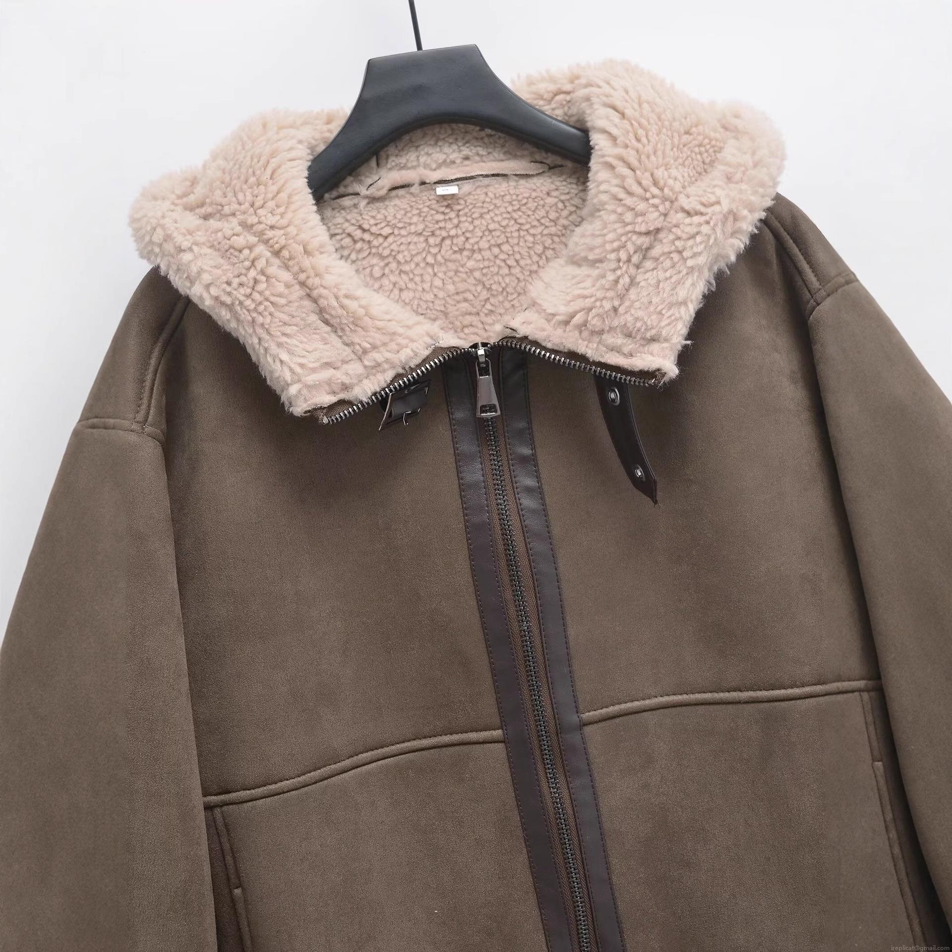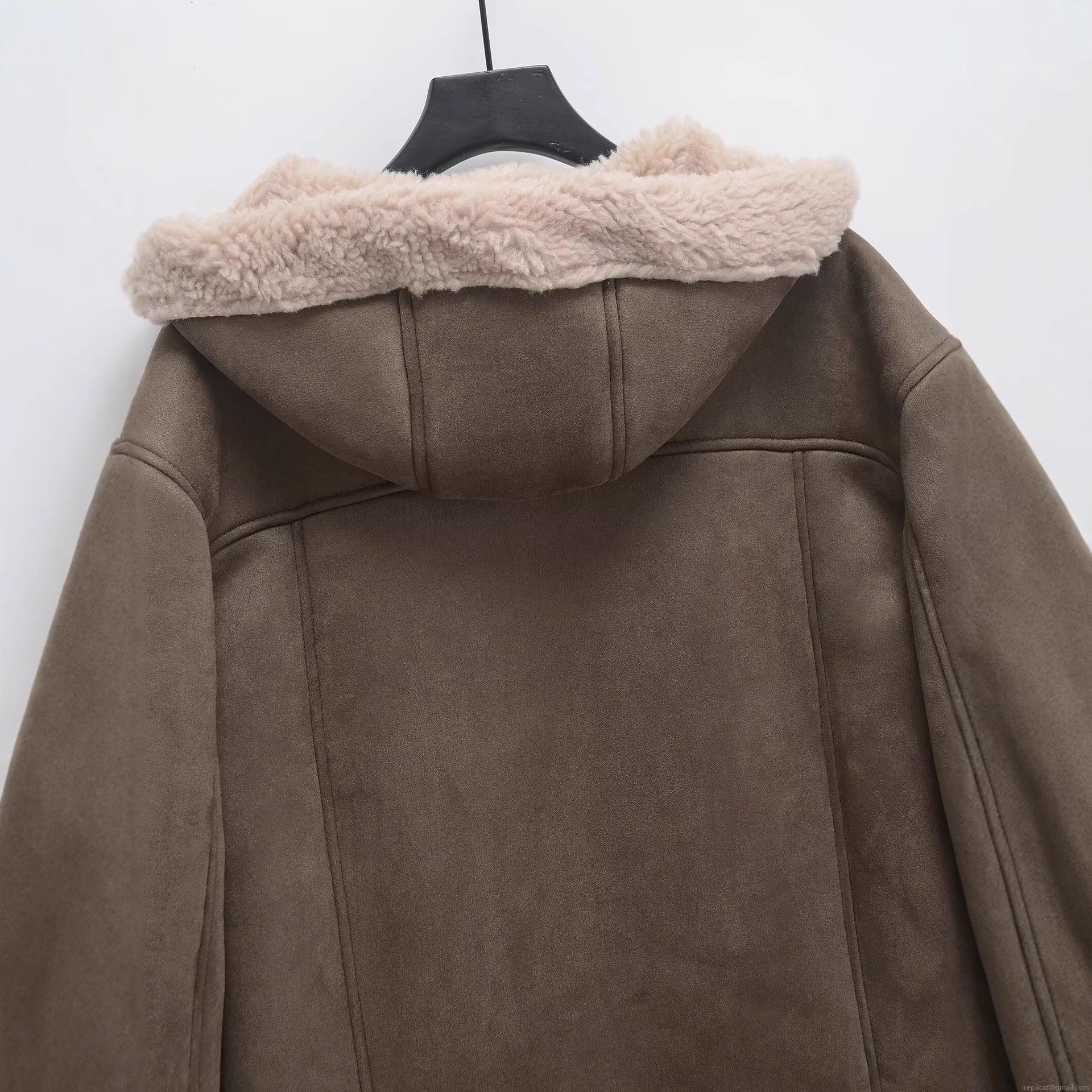 • Women's Vintage Faux Shearling Suede Jacket Warm Thick Fleece Lined Hooded Biker Moto Coat Loose Long Sleeve Casual Outwear With Zipper For Winter
