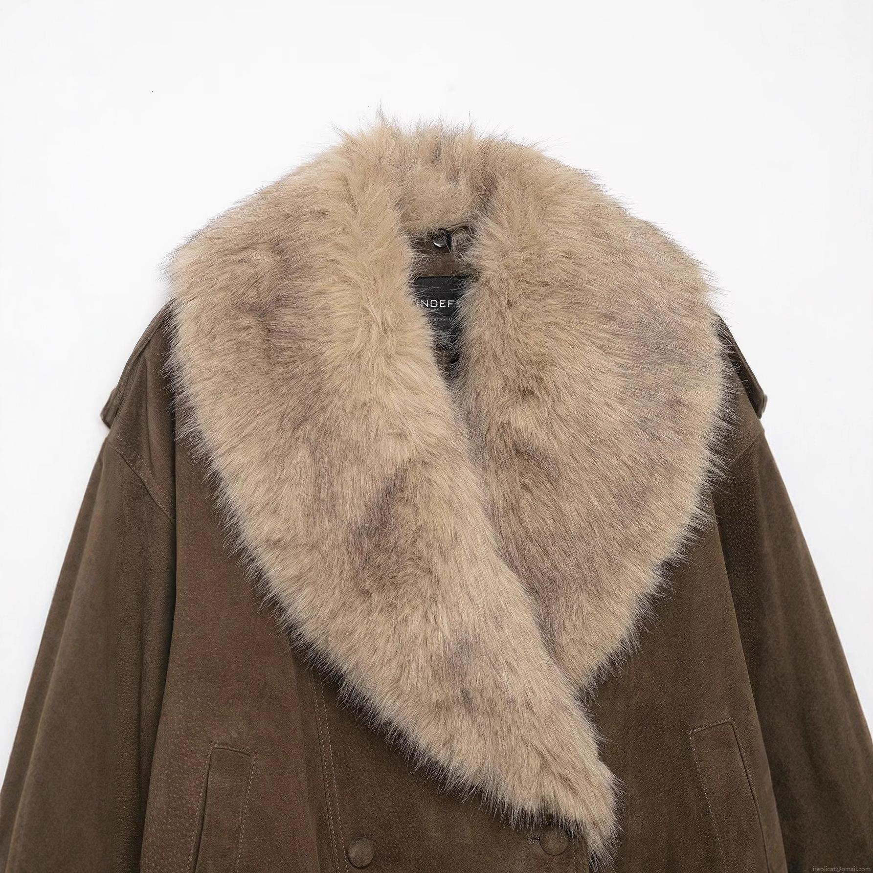 • Women's Vintage Faux Suede Jacket With Large Faux Fur Collar Double Breasted Loose Fit Winter Warm Crop Outwear Streetwear Style Dark Brown Coat