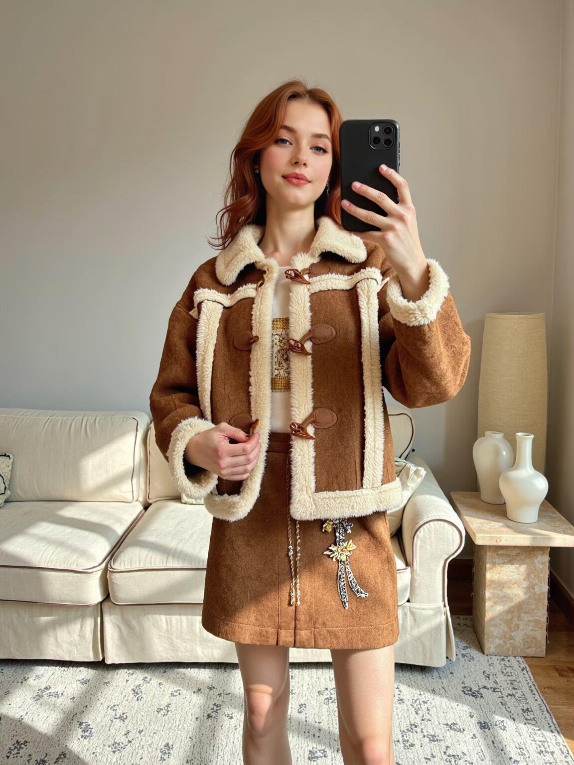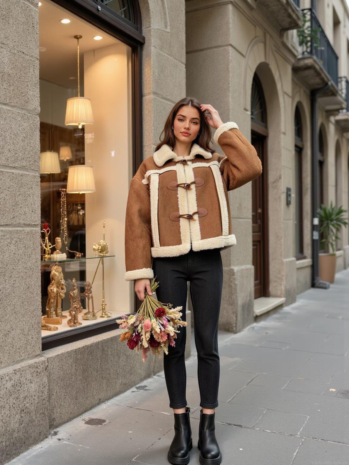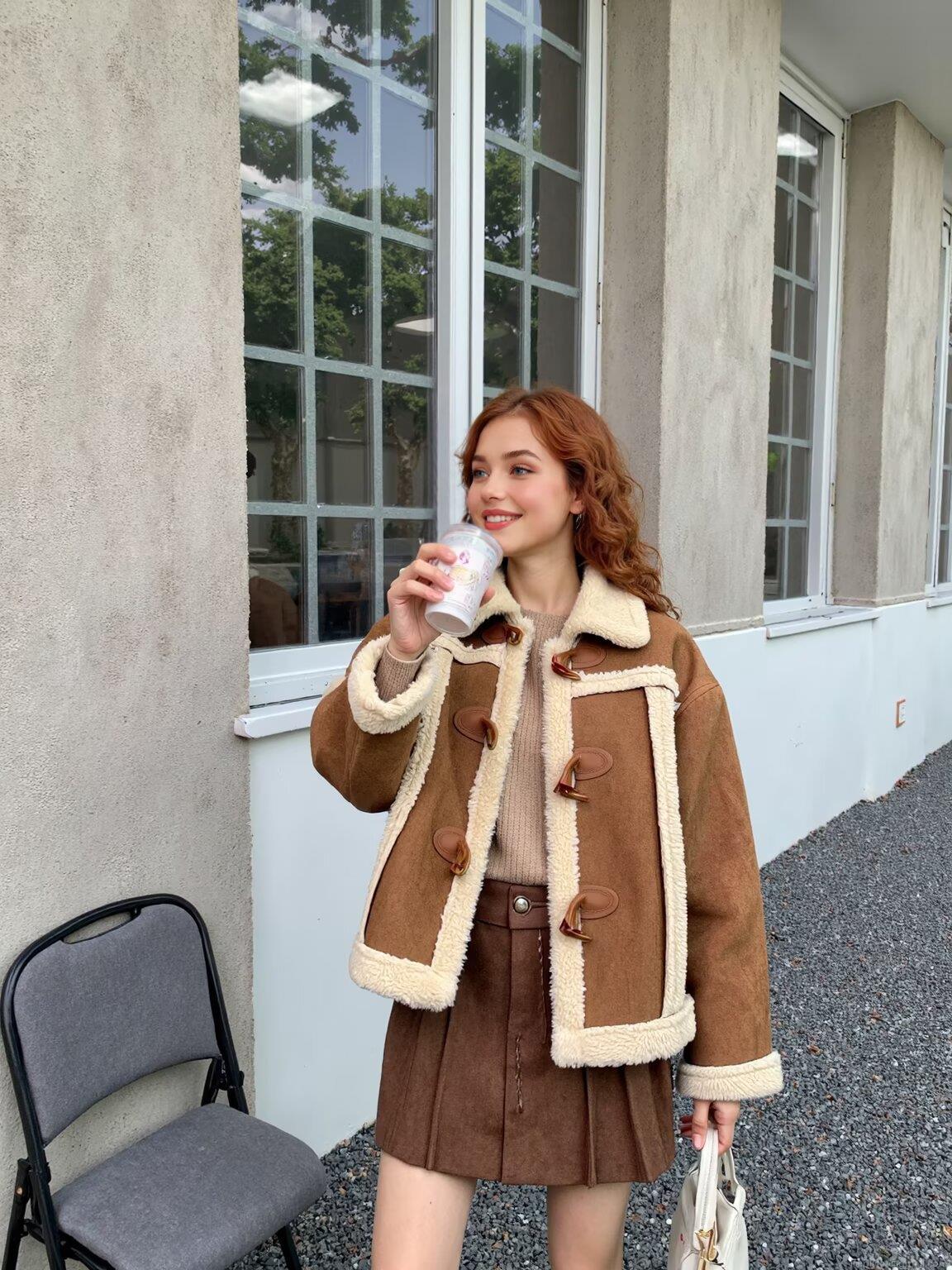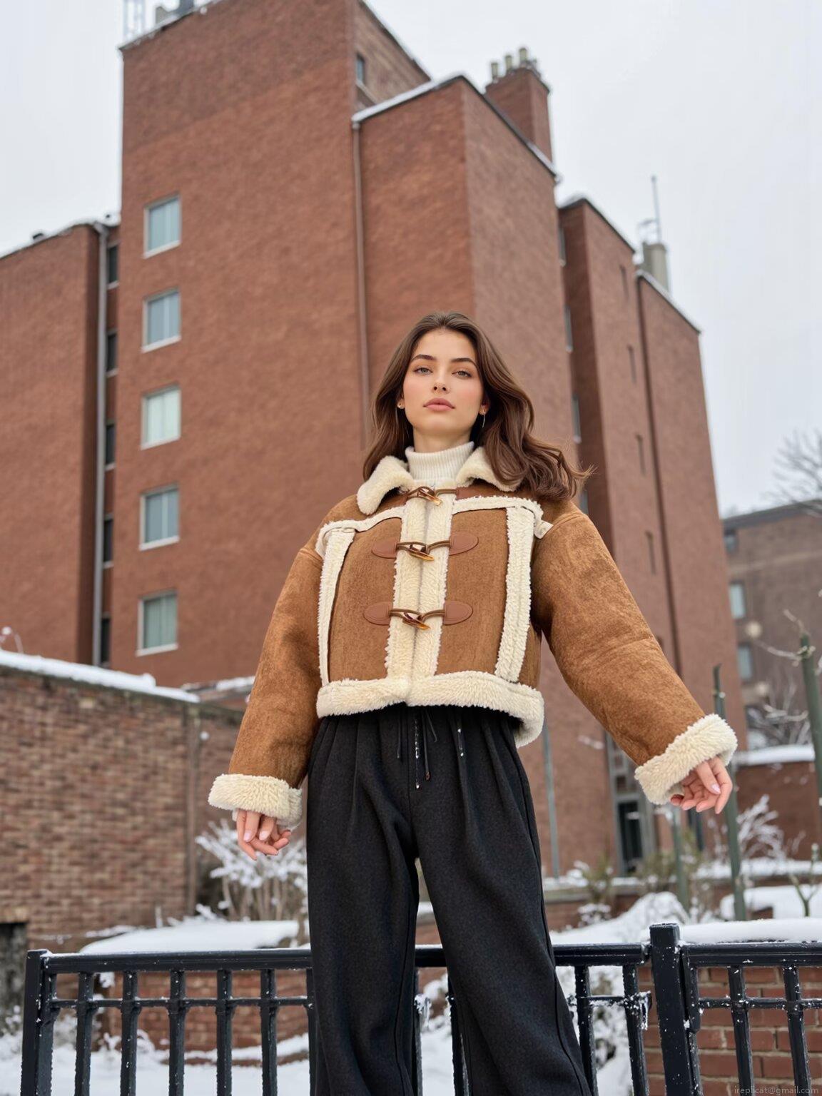 • Women's Vintage Faux Suede Shearling Jacket With Horn Buckle Warm Winter Coat Contrast Trim Lapel Long Sleeve Outerwear For Streetwear Ladies