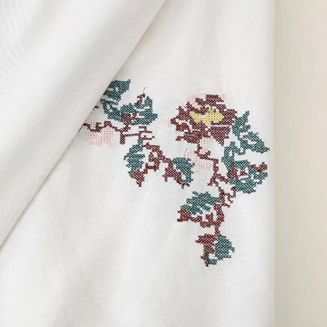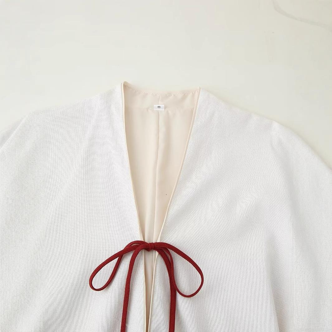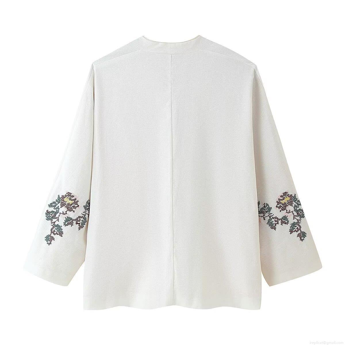 • Women's Vintage Floral Embroidery Kimono Cardigan Jacket Elegant Ivory Linen Blend Long Sleeve Outerwear Top With Red Tie Closure Ethnic Style Streetwear