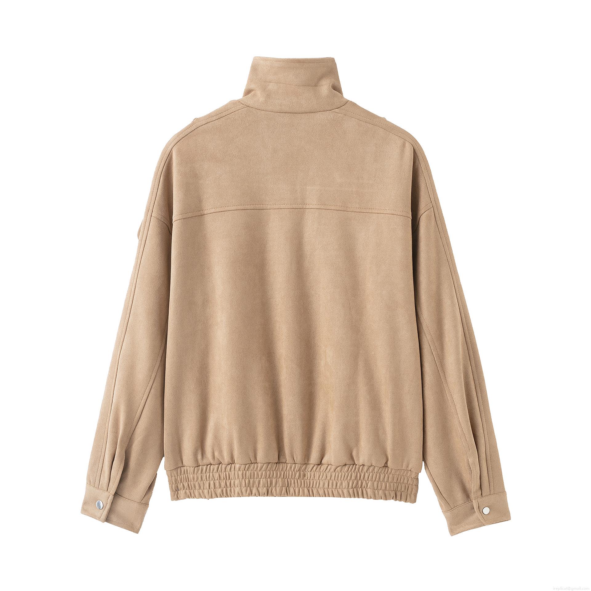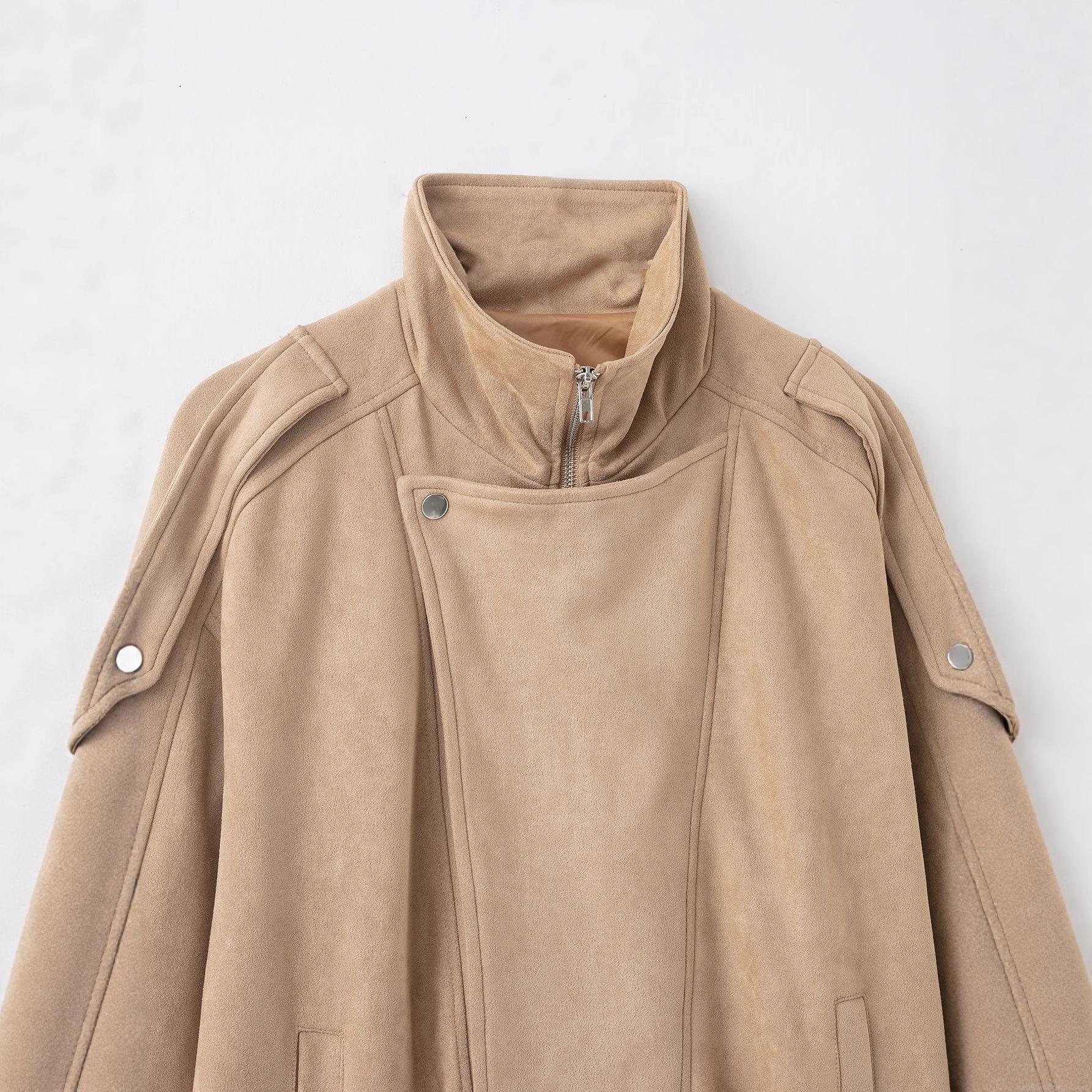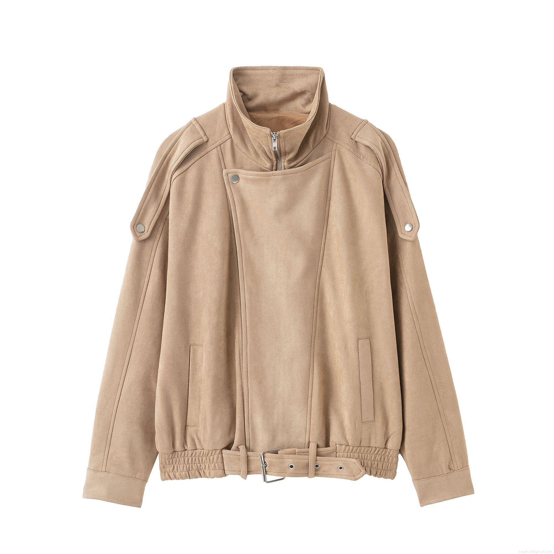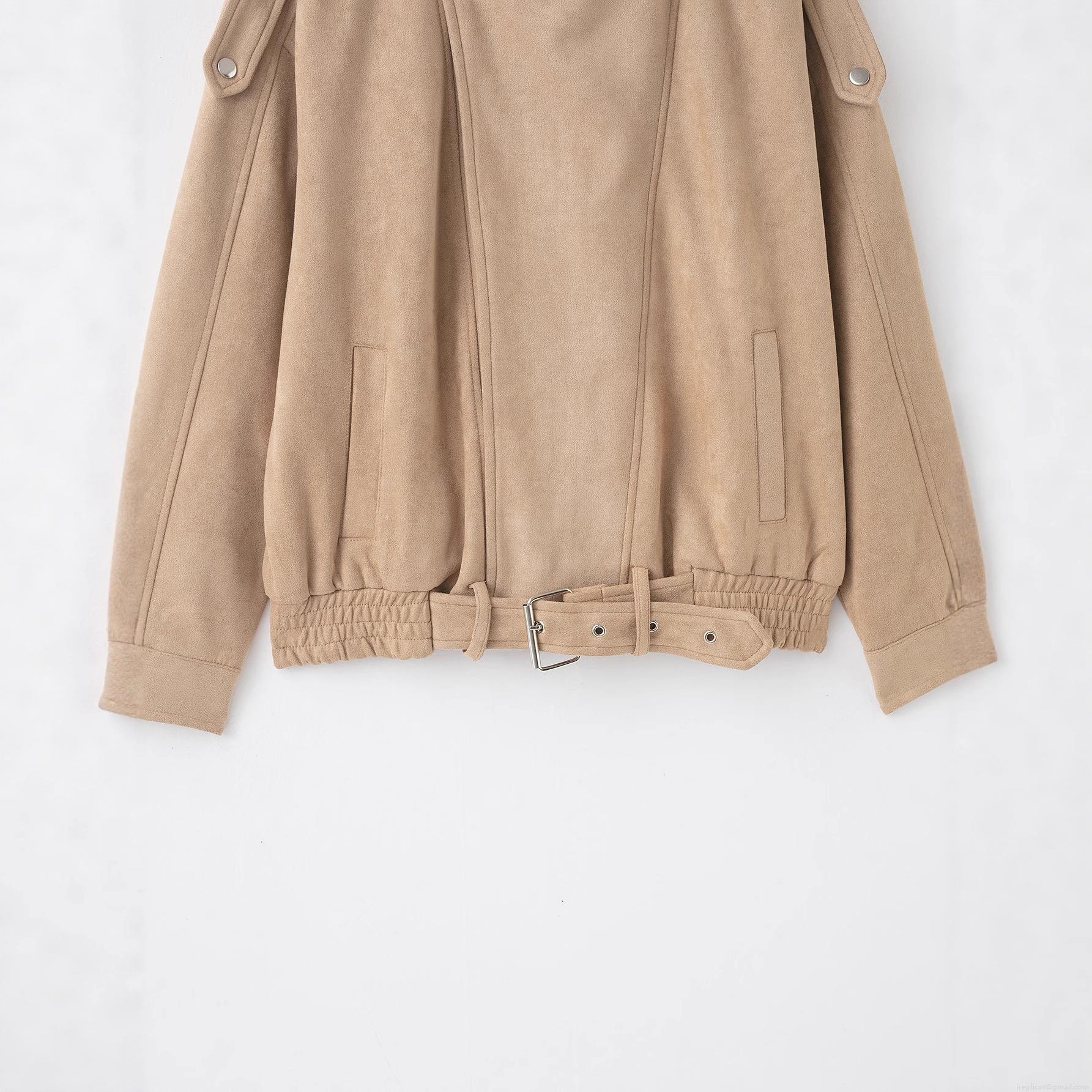 • Women's Vintage French Fashion Faux Suede Jacket With Stand Collar Zipper And Belt Khaki Long Sleeve Short Motor Style Outwear For Women