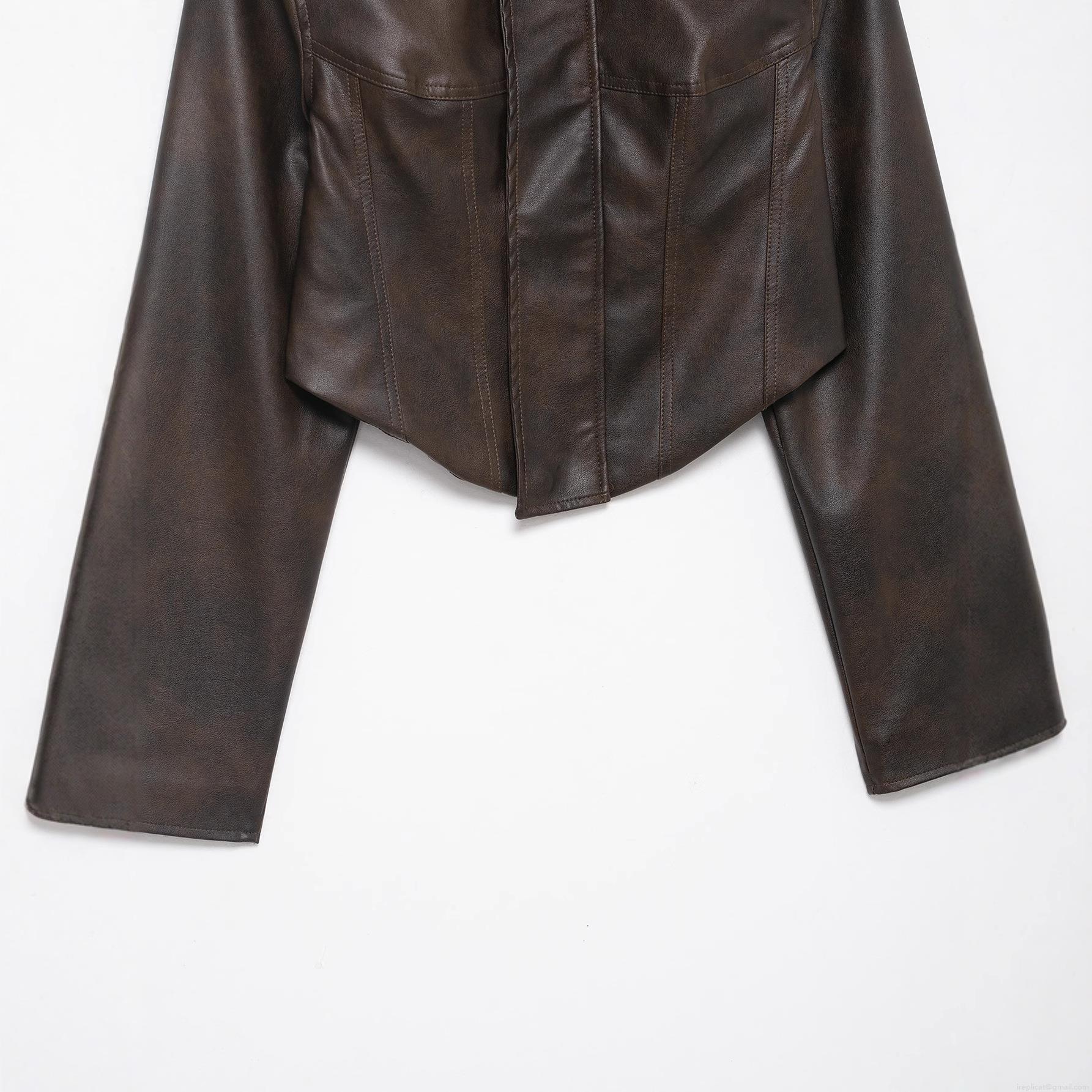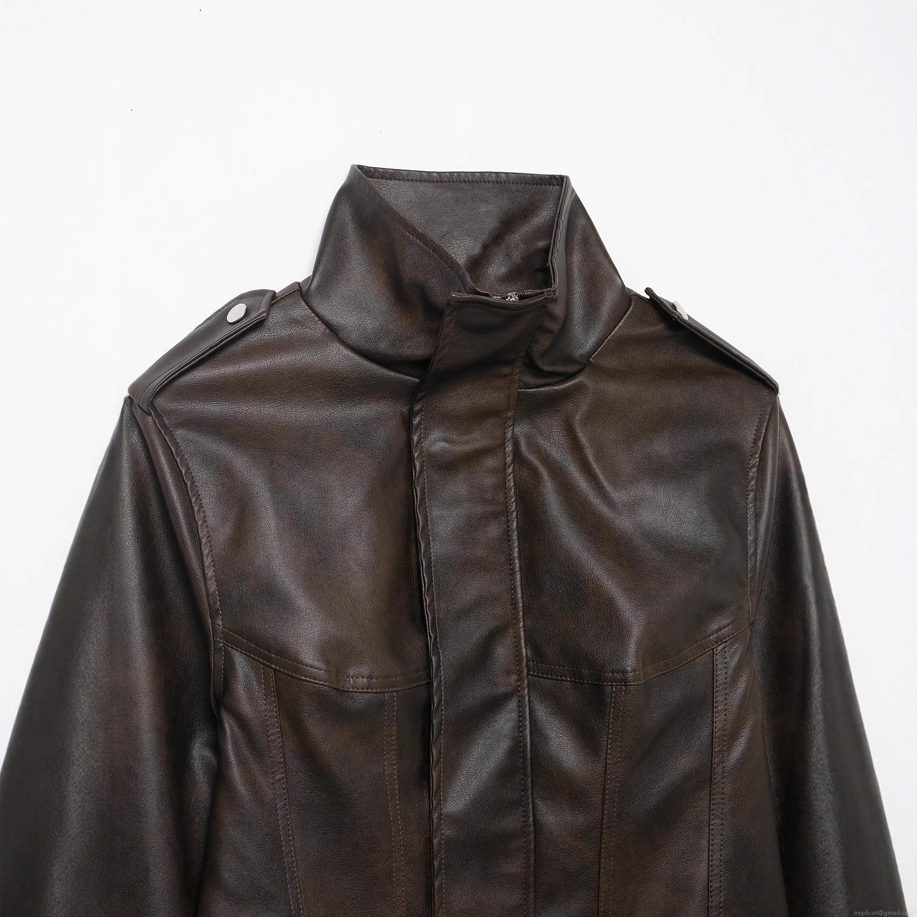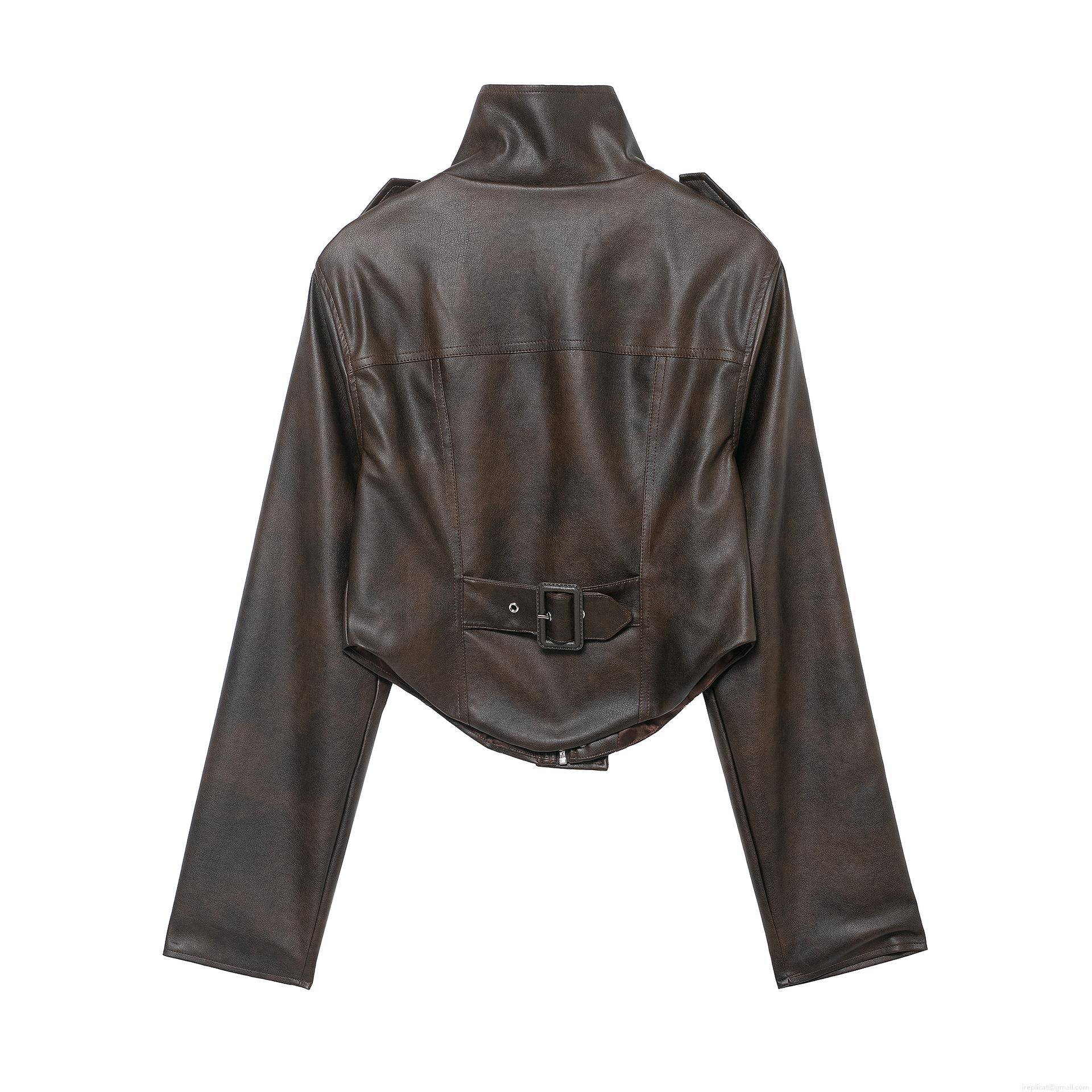 • Women's Vintage PU Faux Leather Jacket Standing Collar Zipper Cropped Moto Biker Coat With Shoulder Straps Brown Casual Autumn Outerwear For Women