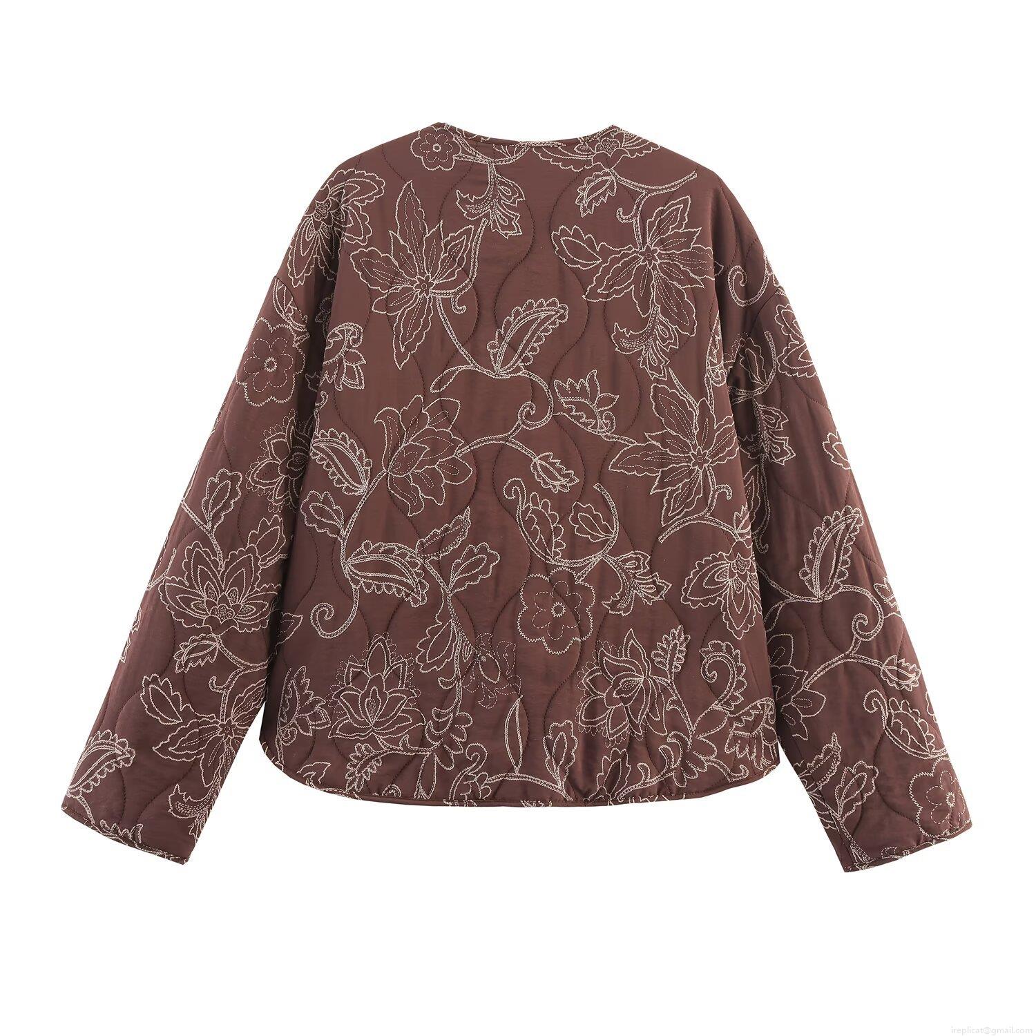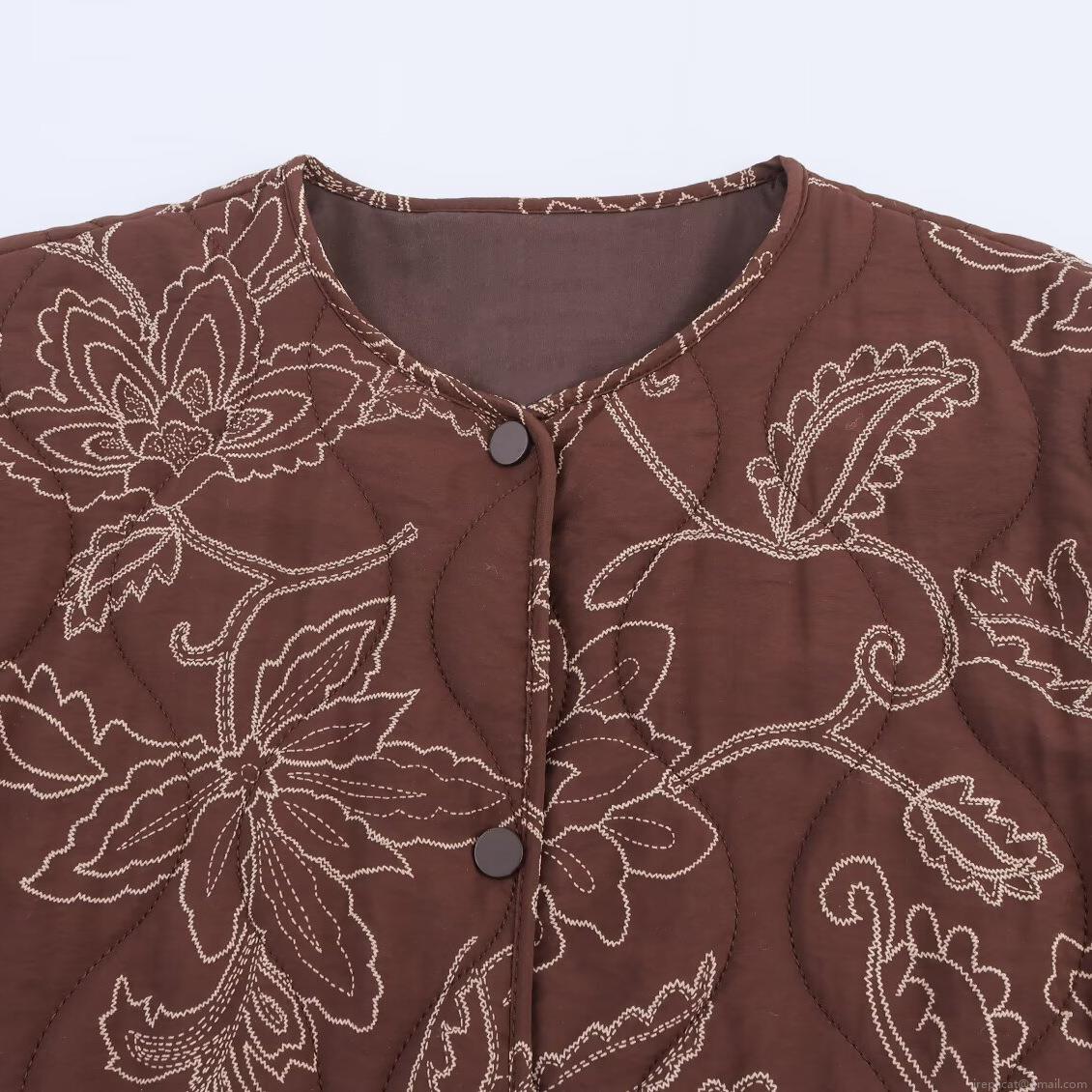 • Women's Vintage Quilted Jacket Floral Print Embroidered Round Neck Button Up Long Sleeve Padded Coat Casual Polyester Spandex Warm Outerwear For Autumn Winter