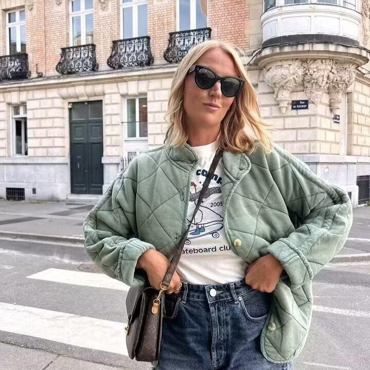 • Women's Vintage Quilted Jacket Loose Stand Collar Diamond Lattice Cotton Padded Coat Casual Warm Outerwear For Autumn Winter Ladies
