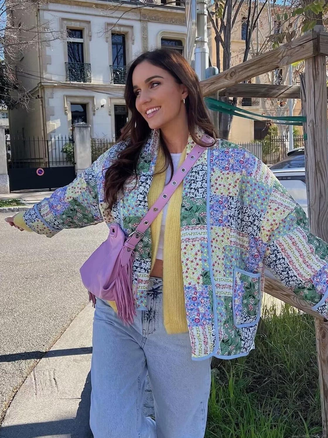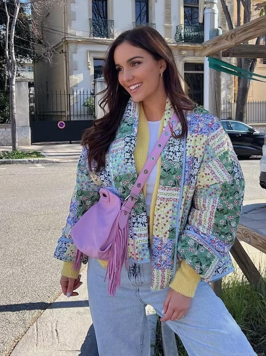 • Women's Vintage Quilted Patchwork Floral Jacket Bohemian Padded Short Coat Long Sleeve V-Neck Open Front Outwear For Autumn Winter