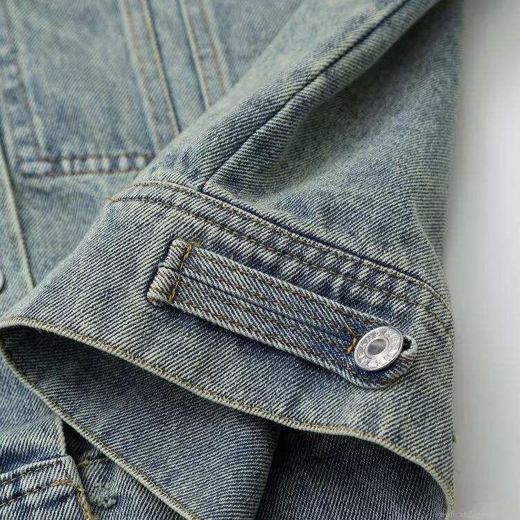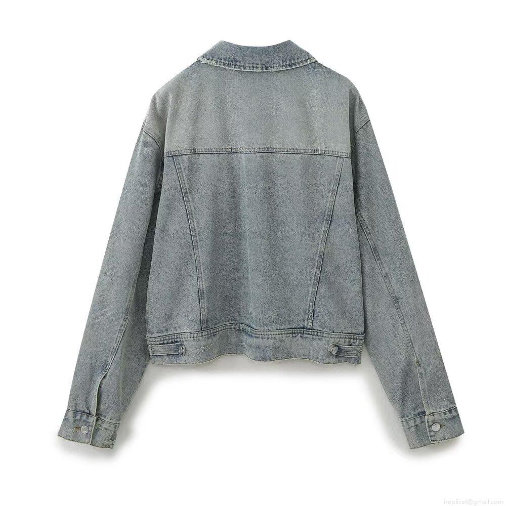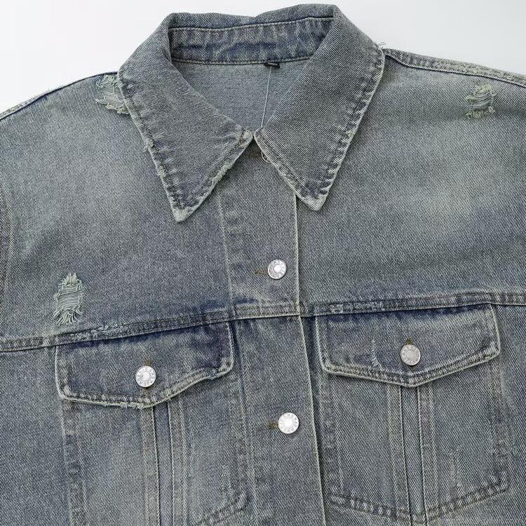 • Women's Washed Distressed Denim Jacket Retro Grey Blue Lapel Long Sleeve Coat With Flap Pockets Casual Streetwear Outerwear For Women Spring Autumn