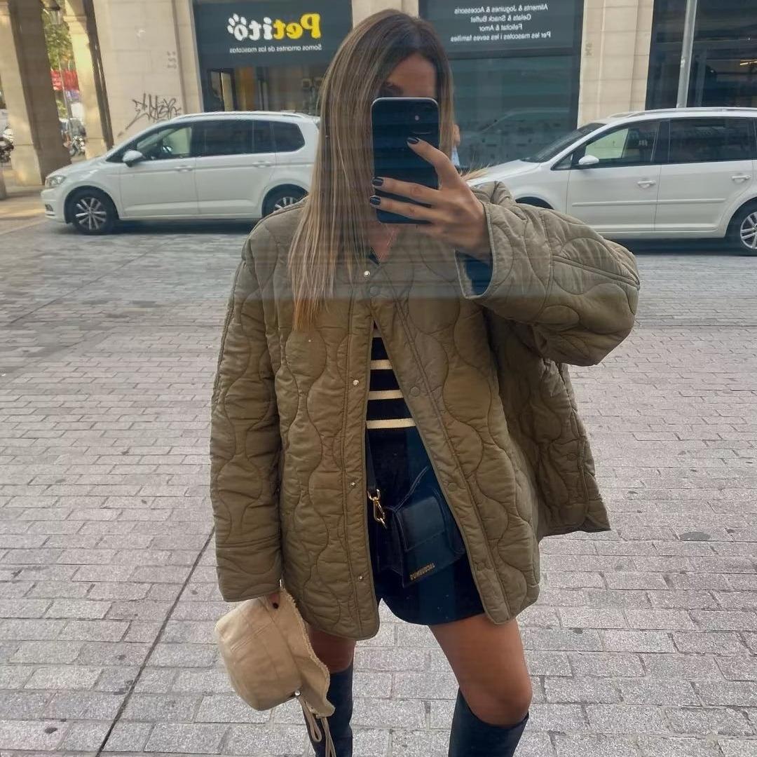 • Women's Wavy Quilted Jacket Lightweight Puffer Coat Loose Round Neck Long Sleeve Button Down Outerwear Streetwear For Women Autumn Winter