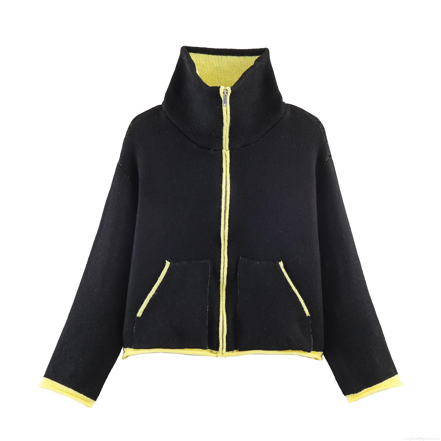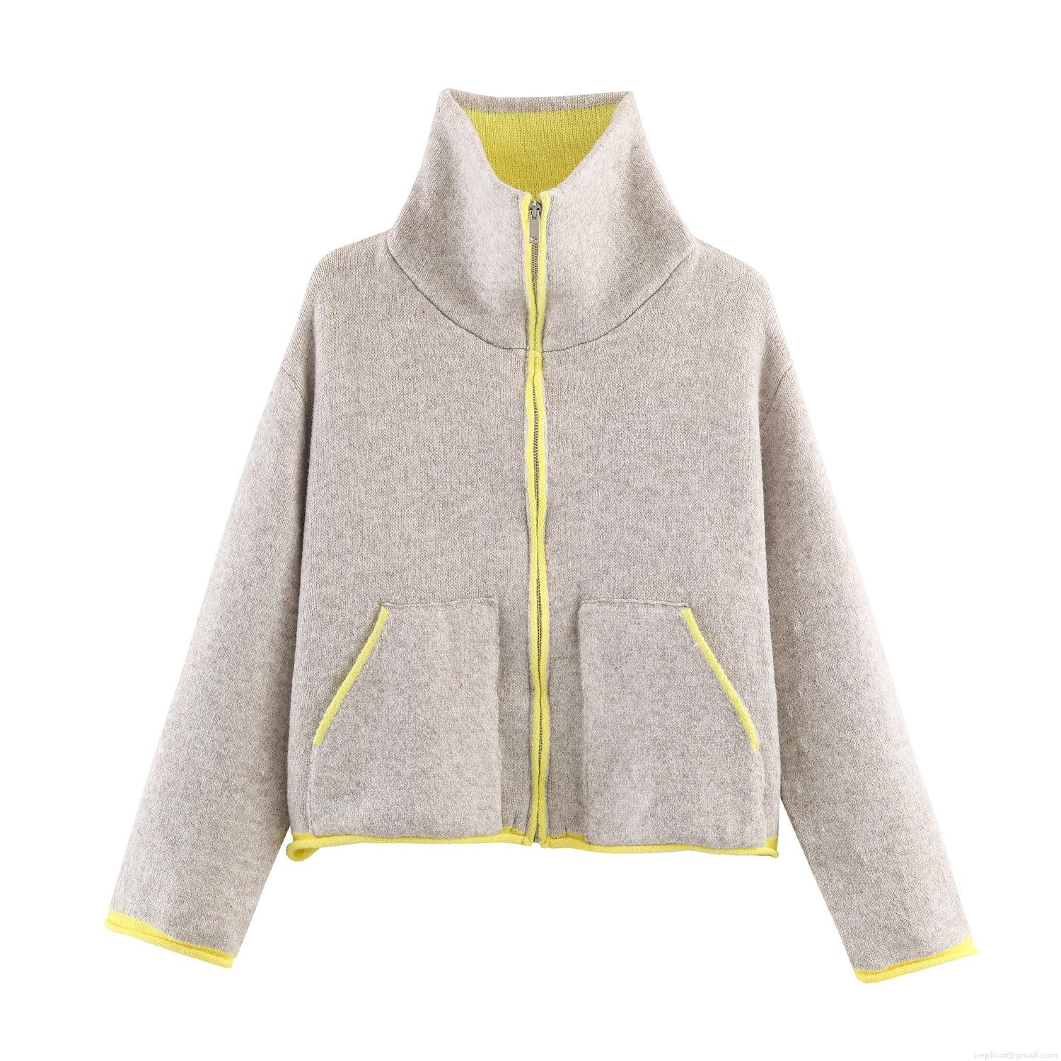 Women's Western Style Sherpa Fleece Jacket Contrast Neon Trim Stand Collar Full Zip Short Coat Casual Warm Pocketed Outerwear