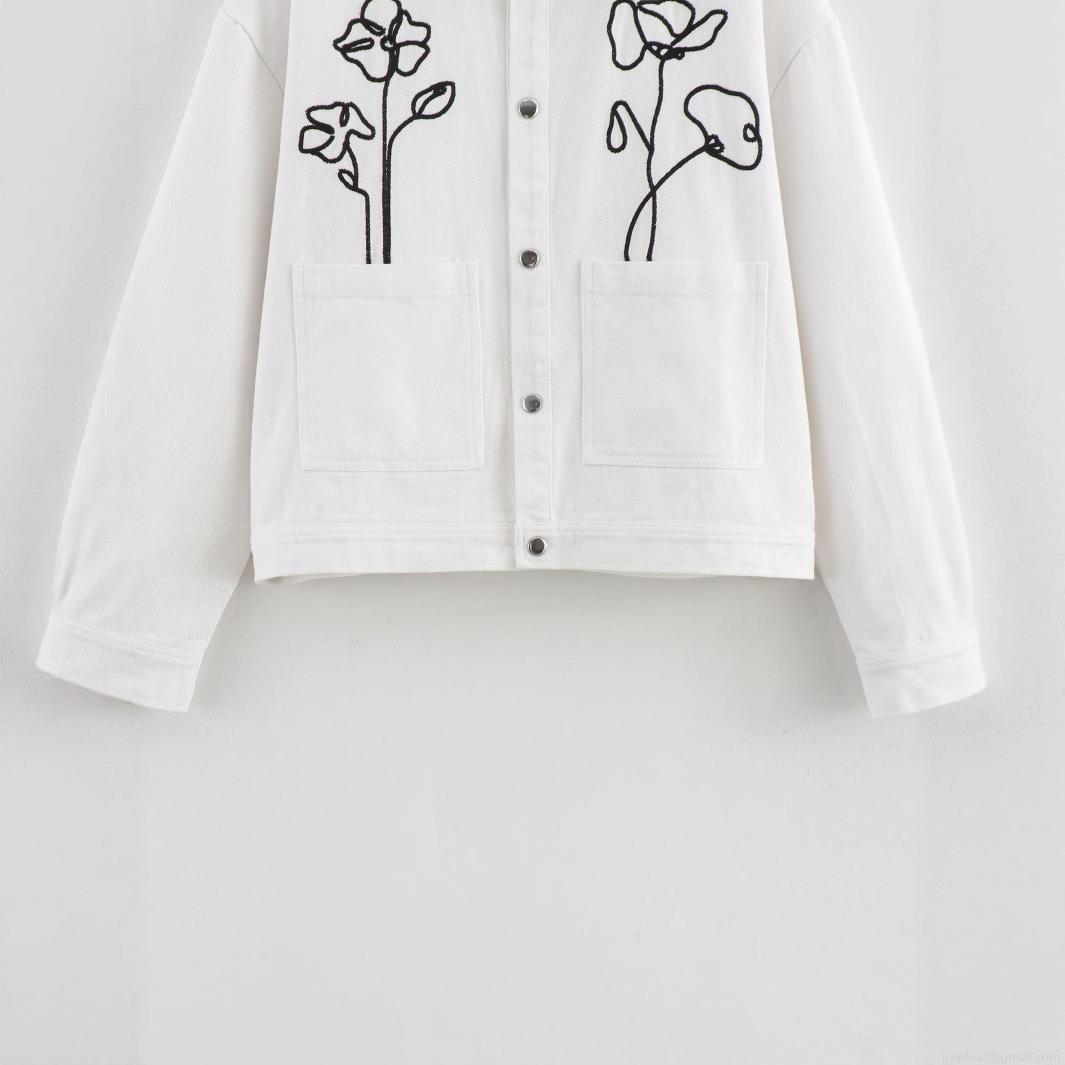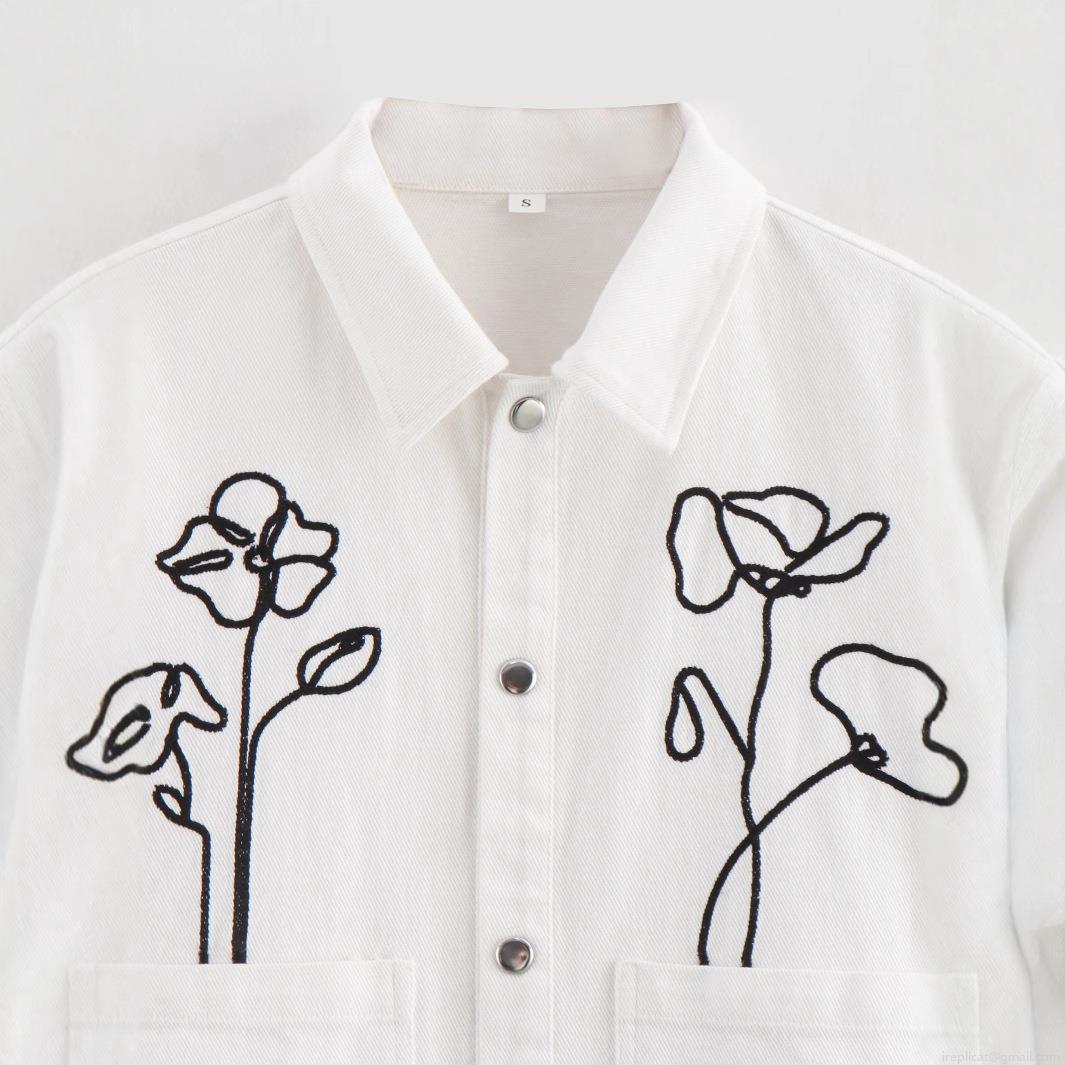 • Women's White Short Jacket With Black Floral Line Embroidery Heavyweight Polyester Long Sleeve Lapel Single Breasted Button Up Streetwear Casual Outerwear