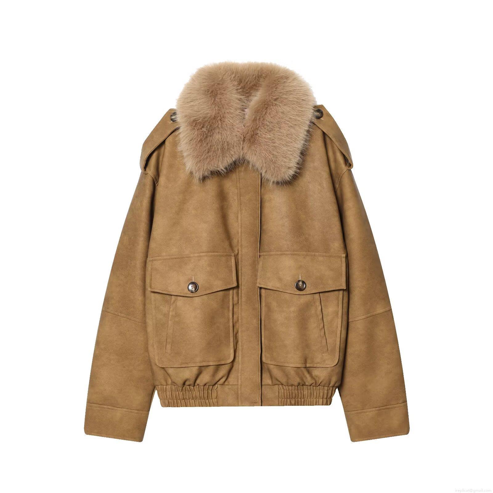 • Women's Winter Bomber Jacket With Large Faux Fur Collar Faux Suede Leather Warm Outwear For Women Elegant Casual Stylish Zipper Cargo Pockets Jacket